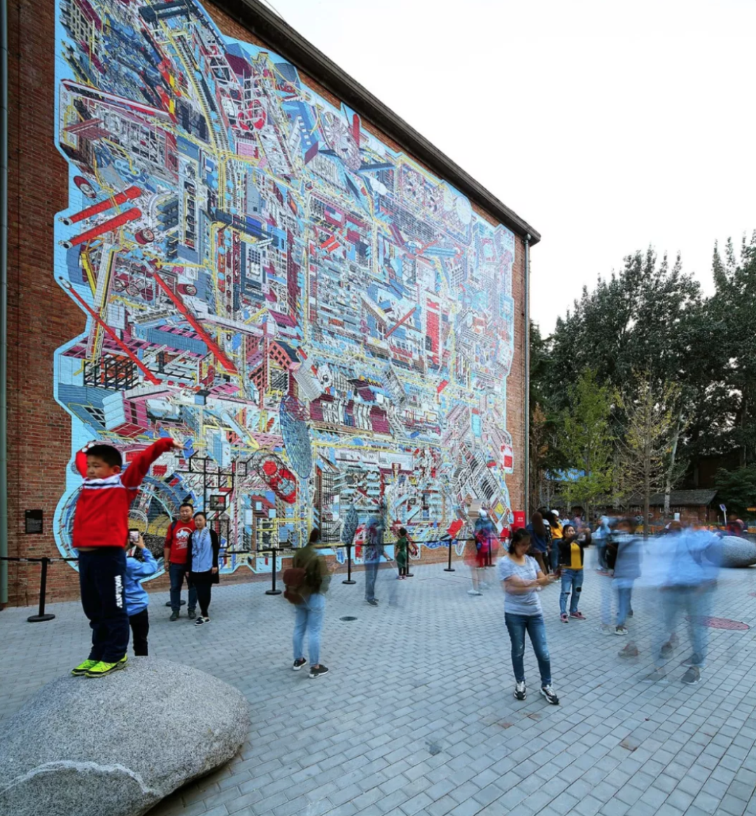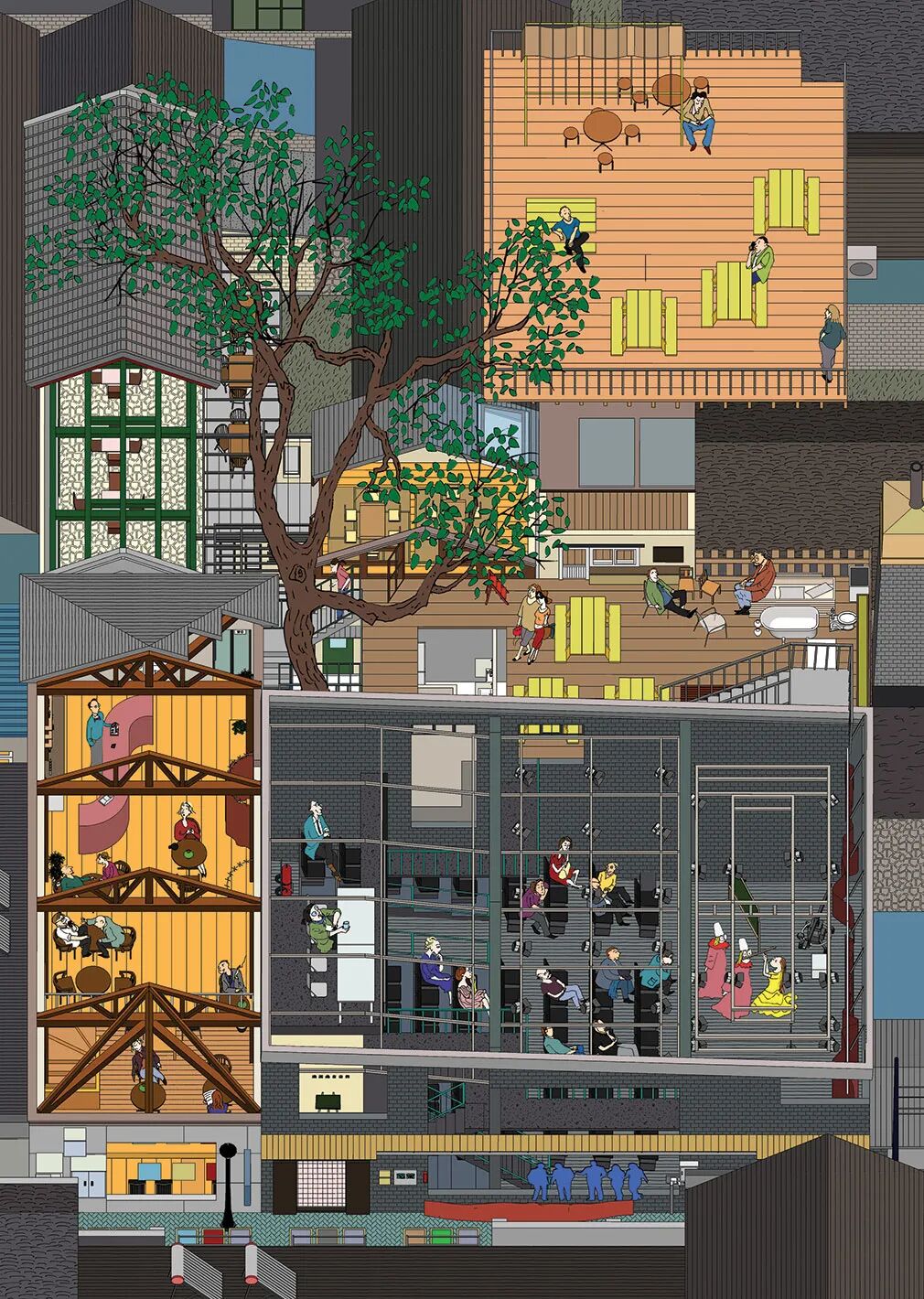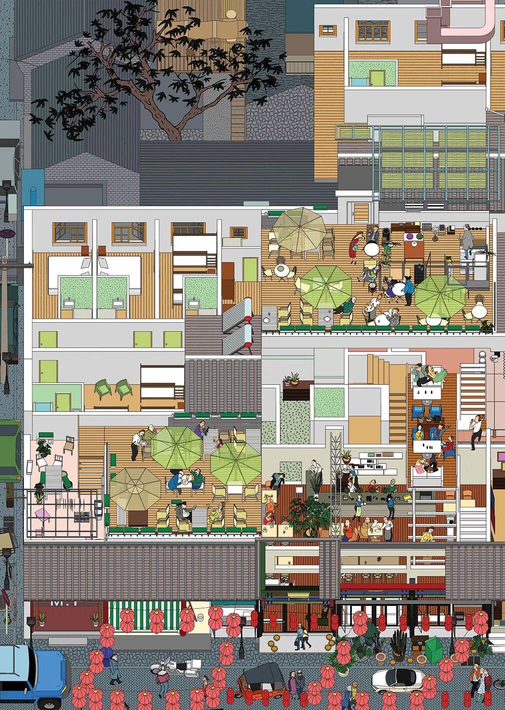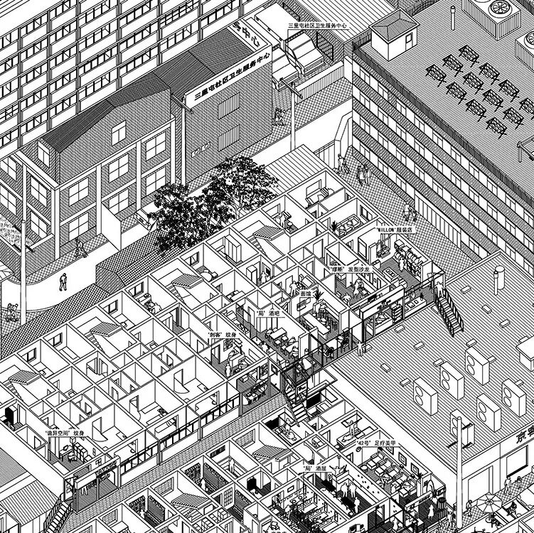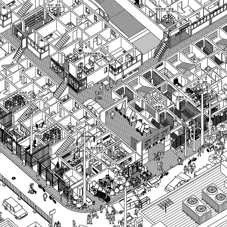 ·绘造社作品《三里屯》:集中整治前的脏街42号楼,数不清的小店,来来往往的男女都被记录在一张高密度的建筑图中。