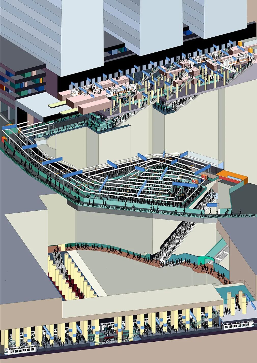 李涵于是想用轴测图记录这个非常复杂的「线性空间」,呈现这个繁忙的空间中的漫长和拥挤,有序与无序,让它成为了一个表现人们日常生活与城市空间相互影响的典型示例。