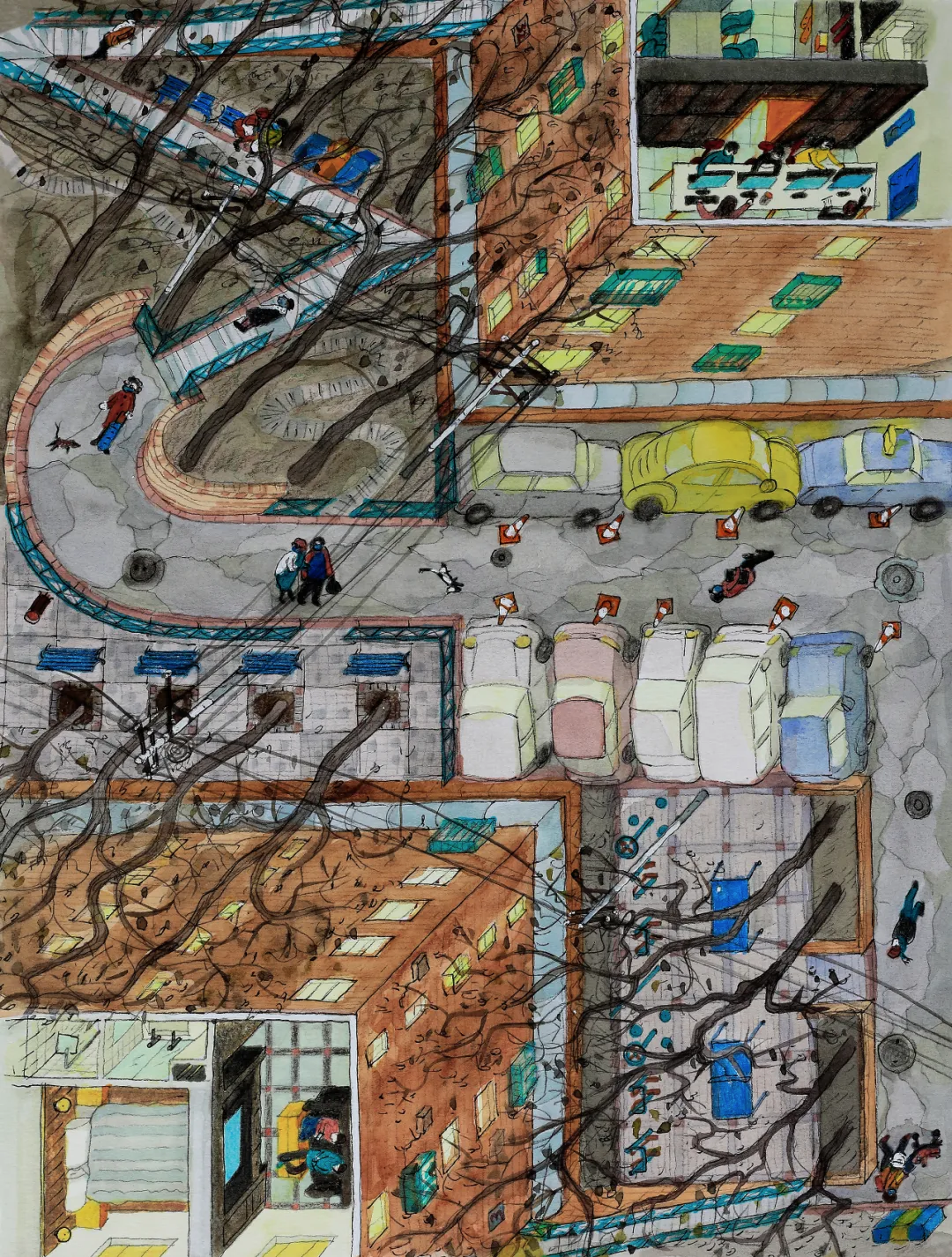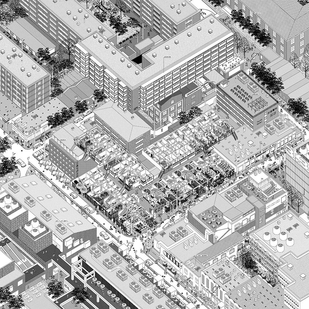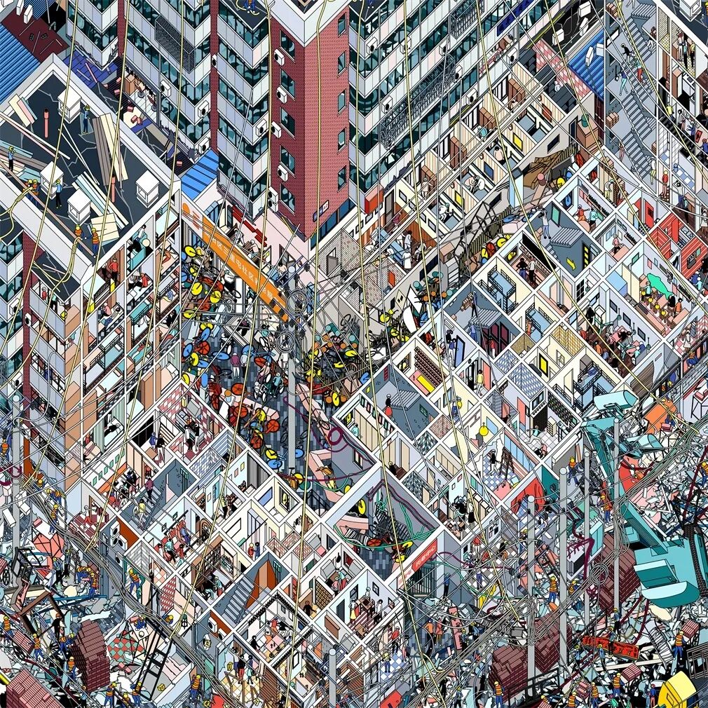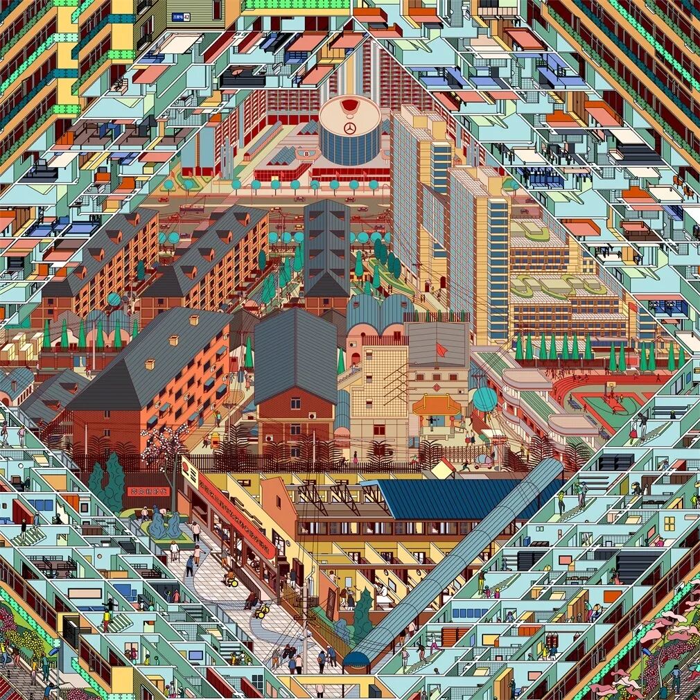 绘制这些让人眼花缭乱的「轴测图」(即一种空间投影视图,纵深的投射不会向灭点收缩,而是保持平行),是李涵观察城市的独特方式。