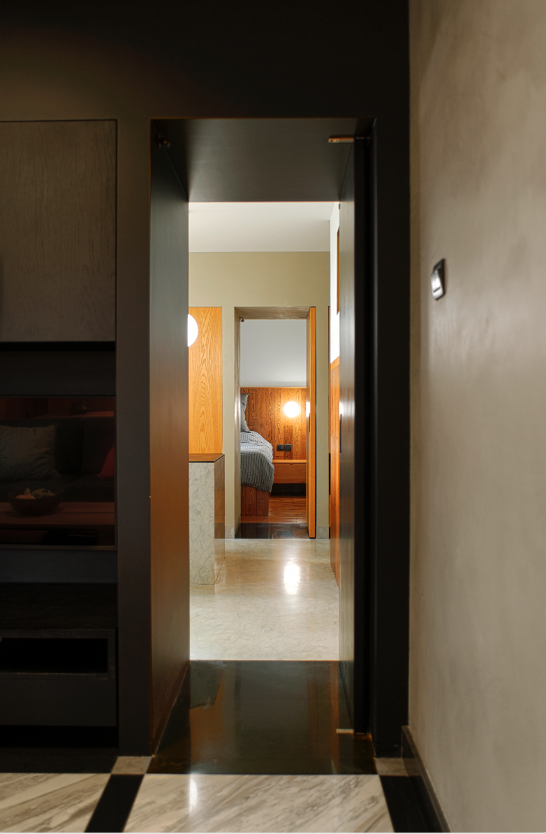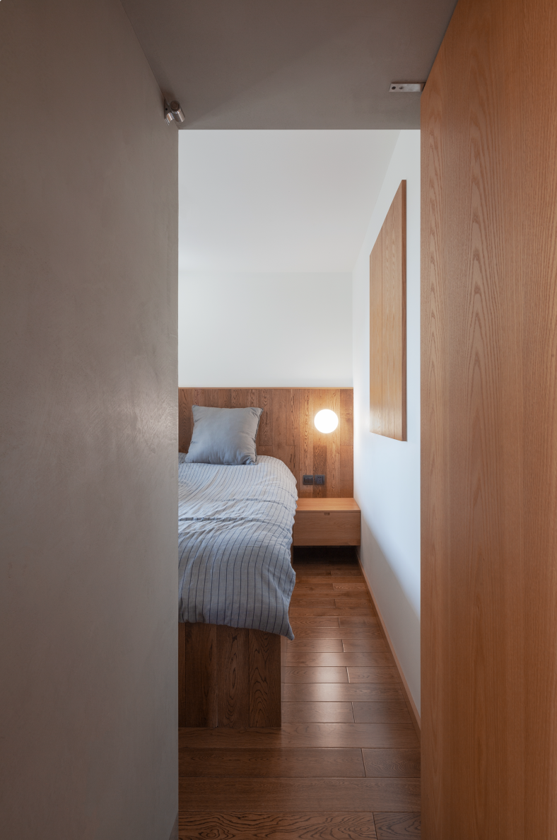 以收纳空间当墙不仅提高了效率,还获得了一种古典建筑墙体的厚度。门不再是门,而是门洞。