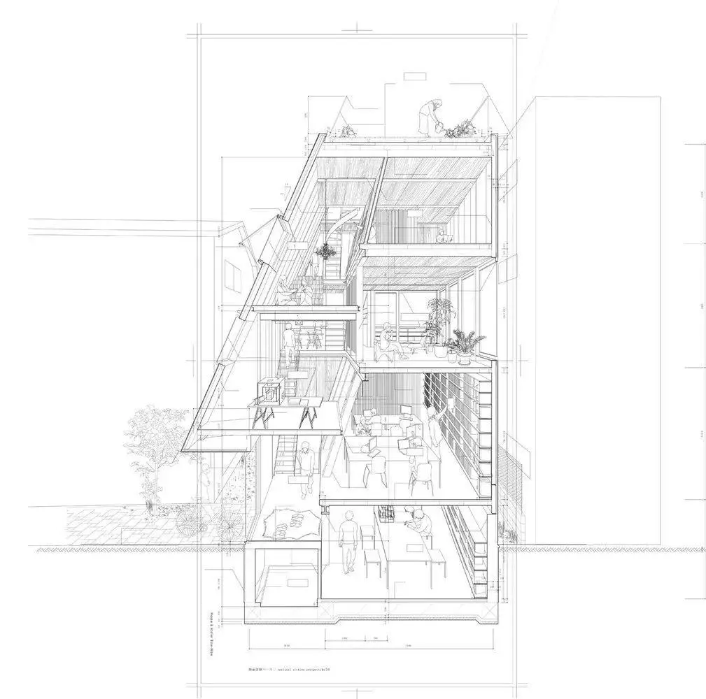 他无数次地深入现场,最终通过剖切的方法,用一把「无形的刀」在遮挡物上切开口子。不仅避免了遮挡带来的空间表达的局限,也清晰反映了元素的前后关系。