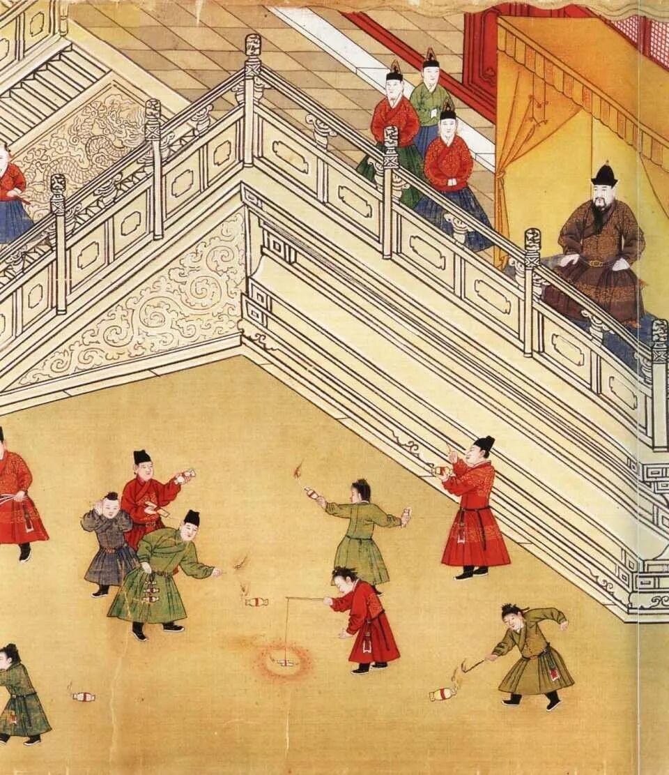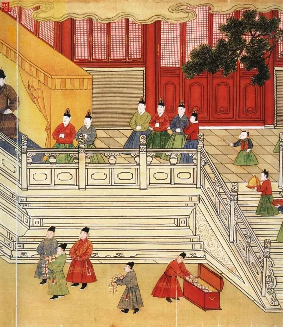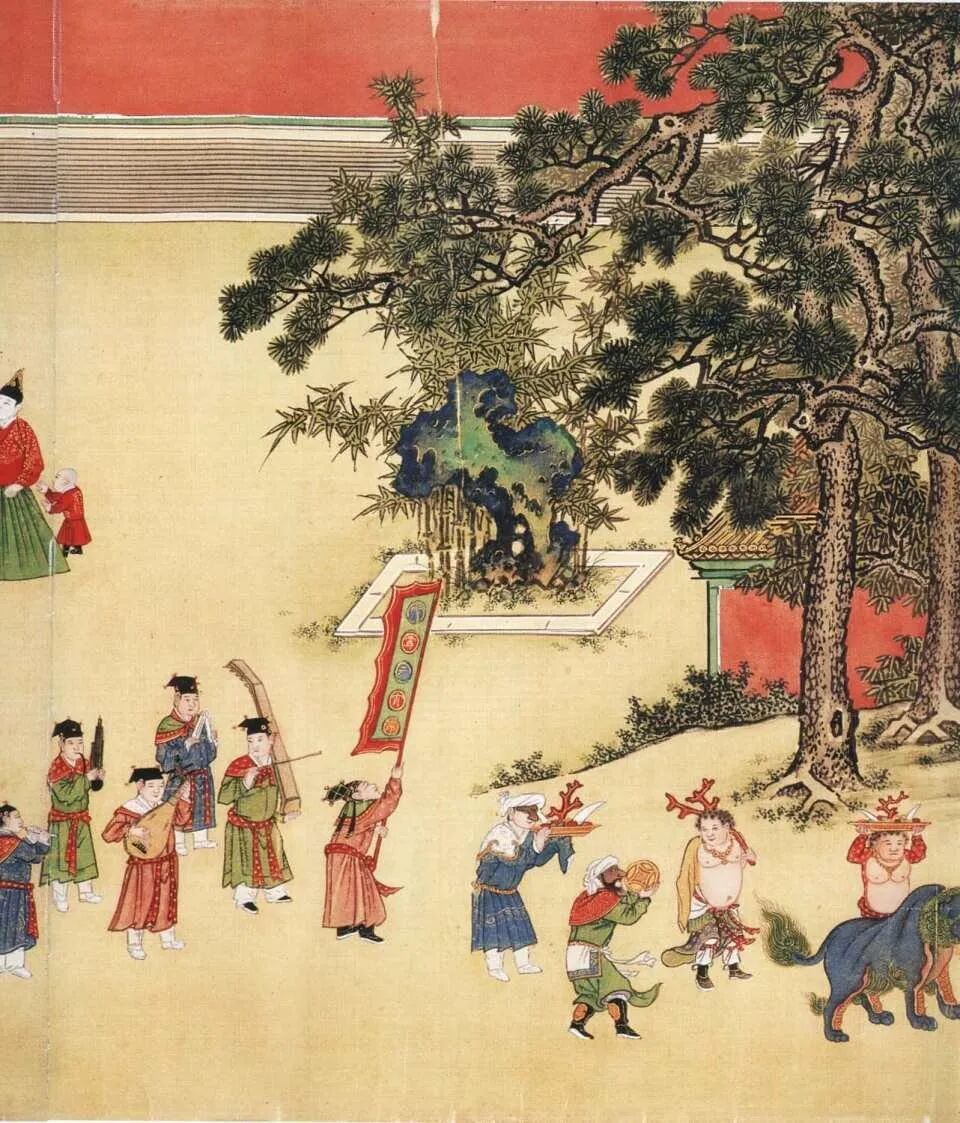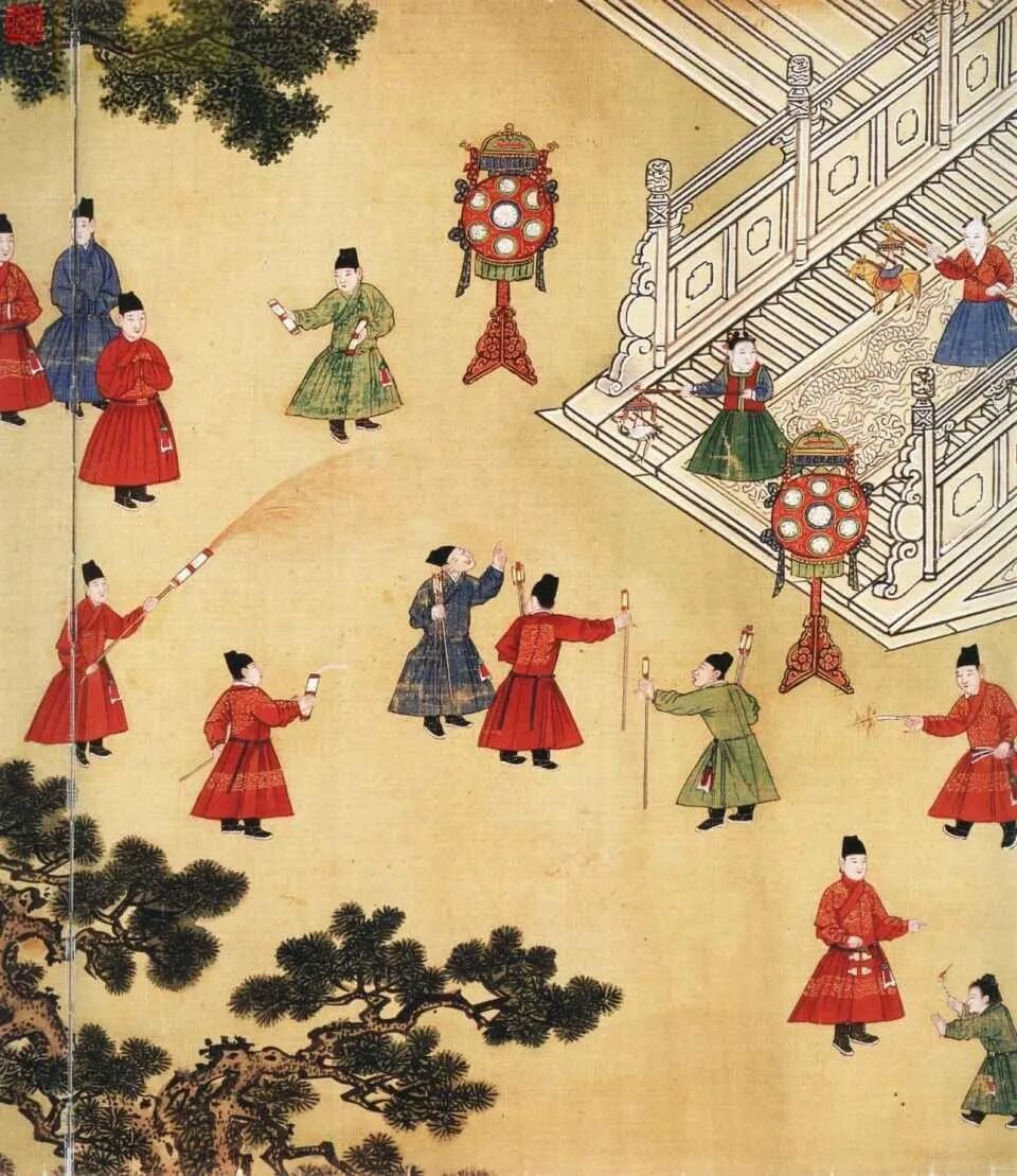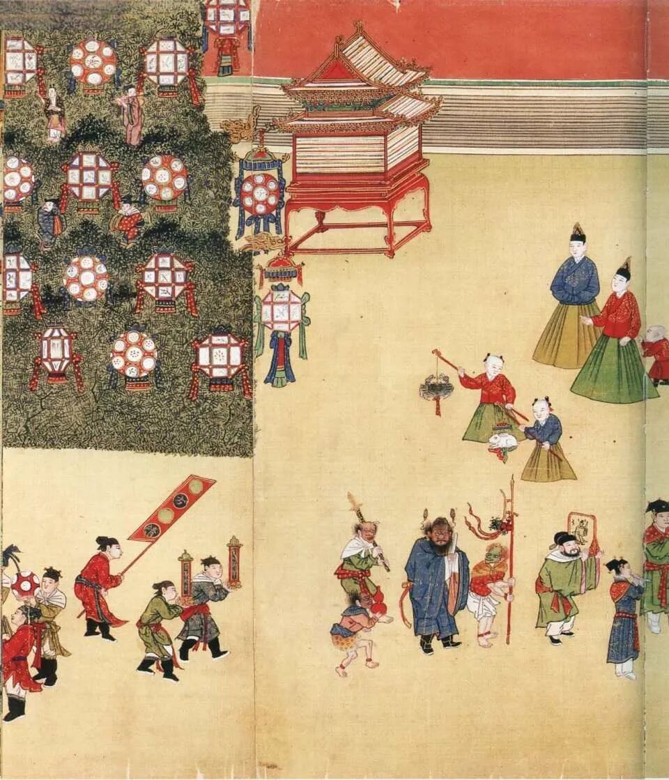 画面中,从早至晚的各种节目,场面均有宪宗在场,其中演出、杂技、魔术、烟花爆竹及整山灯市等场面恢宏。画中,还有在宫内设街市,模仿民间**俗放爆竹、闹花灯、看杂的情景。图中身着便服的朱见深坐在殿前围帐中,侍臣们立于两旁,殿上悬有彩灯,一派繁华。