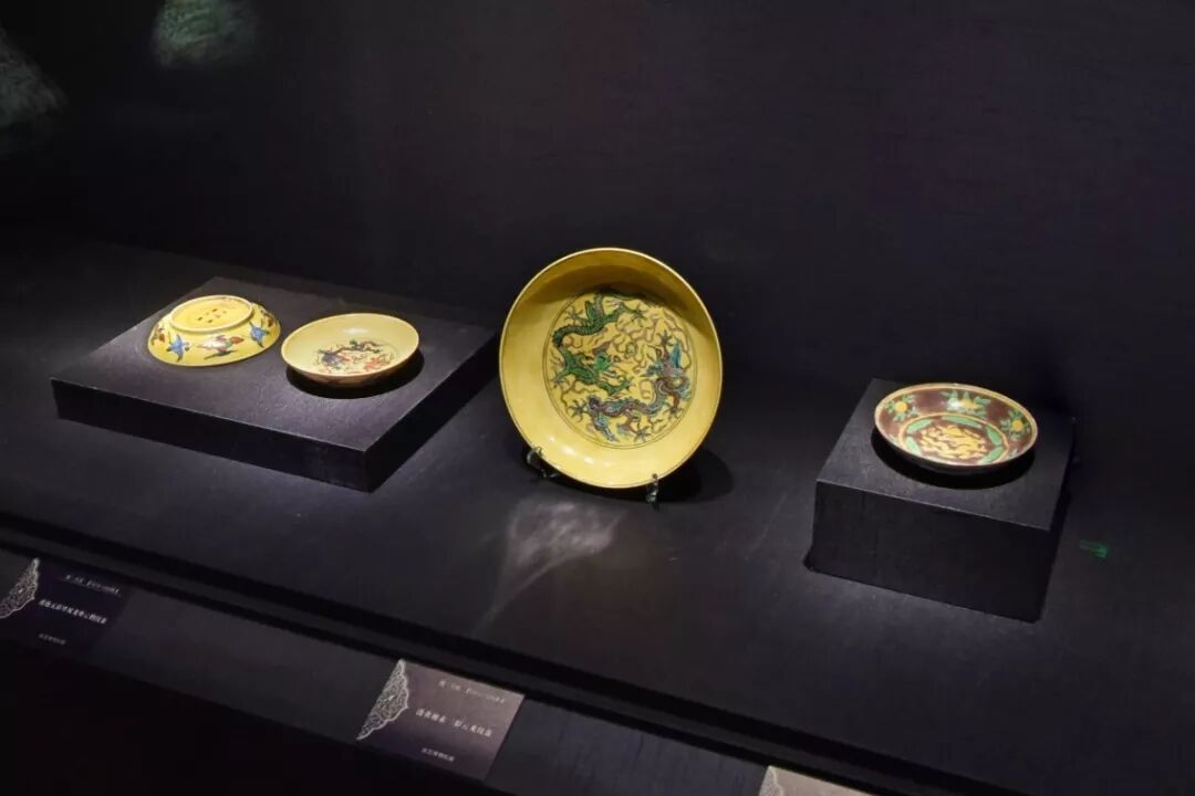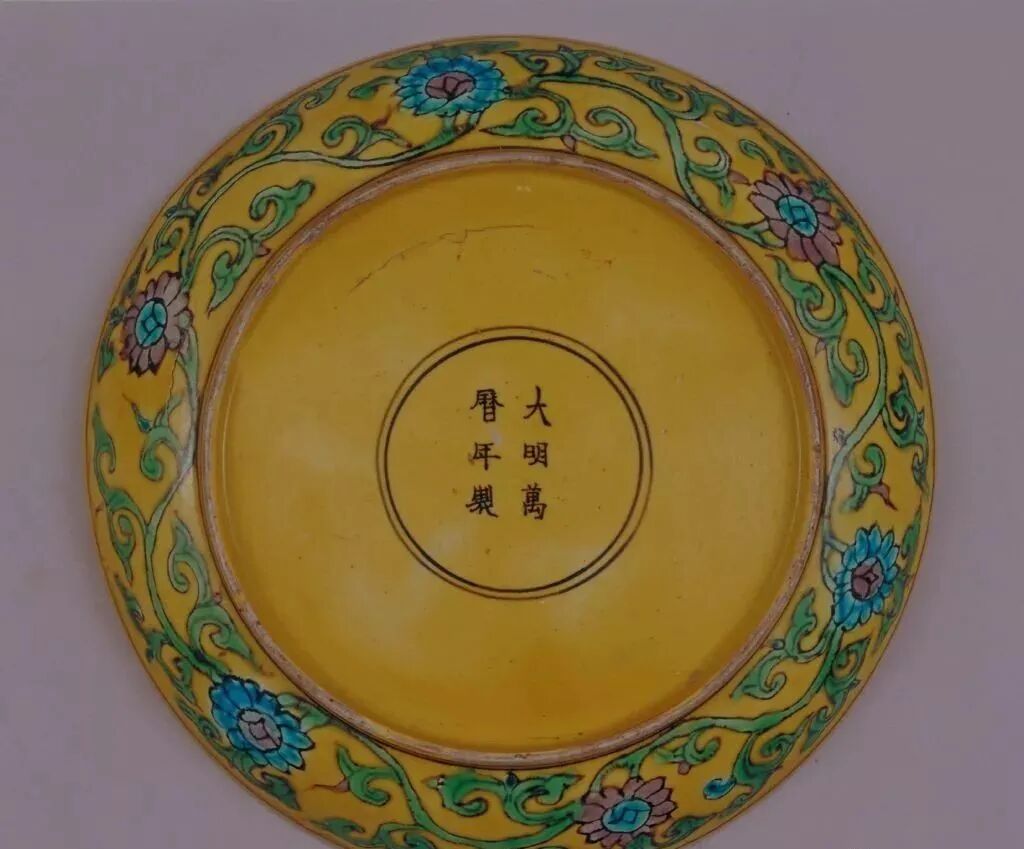 万历朝景德镇御器厂还新创烧一种黄地青花五彩瓷器,系彩饰完工后再在图案空白处填涂低温黄 釉,入低温彩炉焙烧后,黄地与诸彩相映生辉,于艳丽中平添几分含蓄柔和之美。