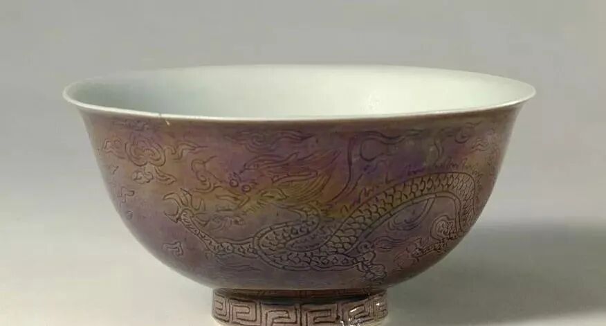 右二 明万历淡茄皮紫釉暗划云龙纹碗 高7.3cm,口径15cm,足径5.5cm