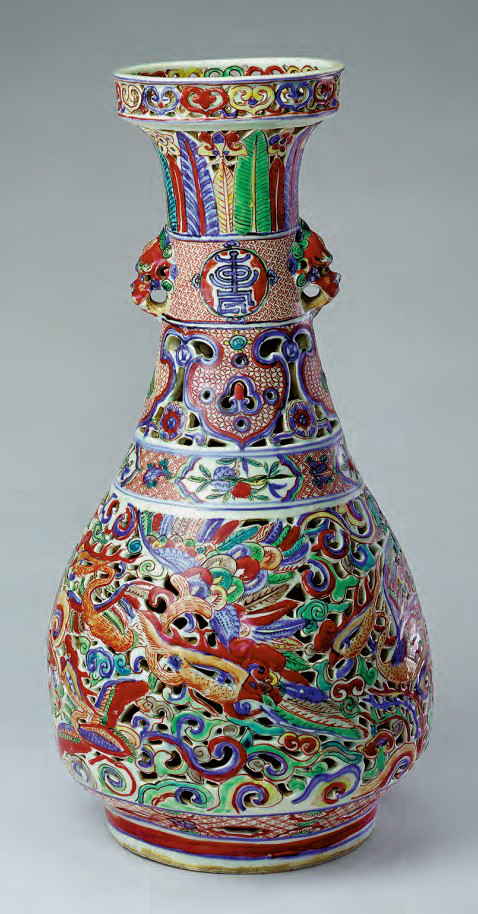 左 明万历五彩镂空云凤纹瓶高49.5厘米
