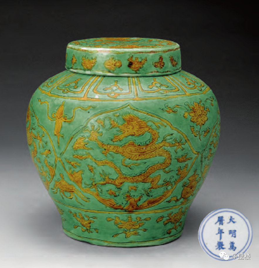 右一 明万历黄地绿彩开光海水云龙纹盖罐 通高19.1厘米