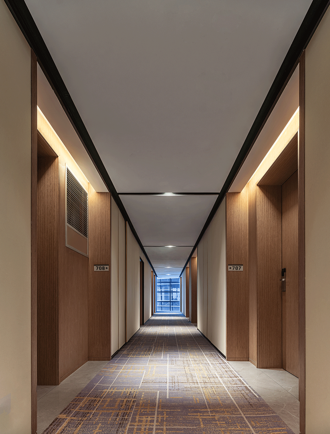 标准客房则通过大面积干净且温润的白墙构建空间主体,狭长的过道以及空间用具的处理形式,拓宽空间视觉广度,给人以更加舒适、宁静的空间氛围状态。
