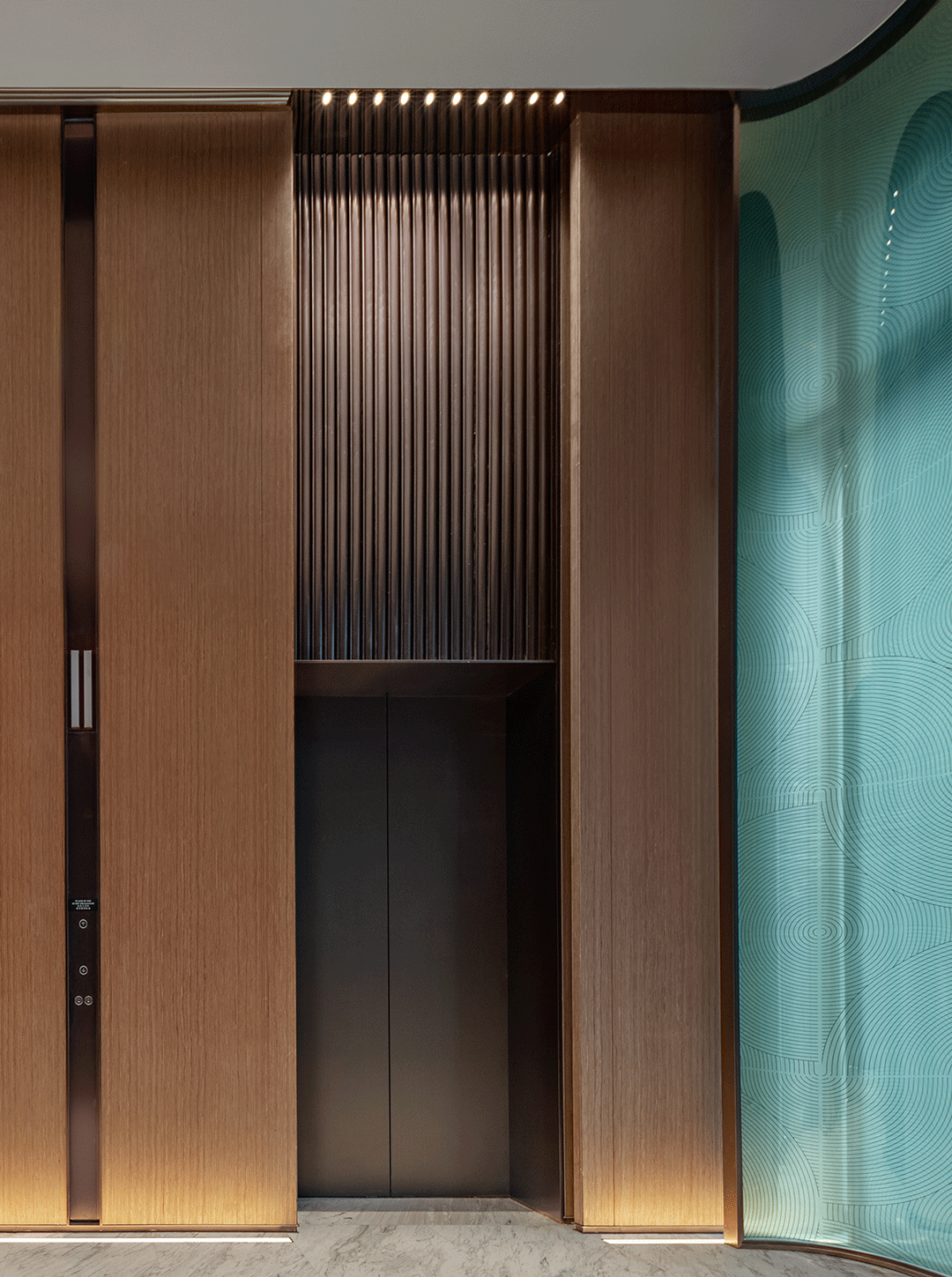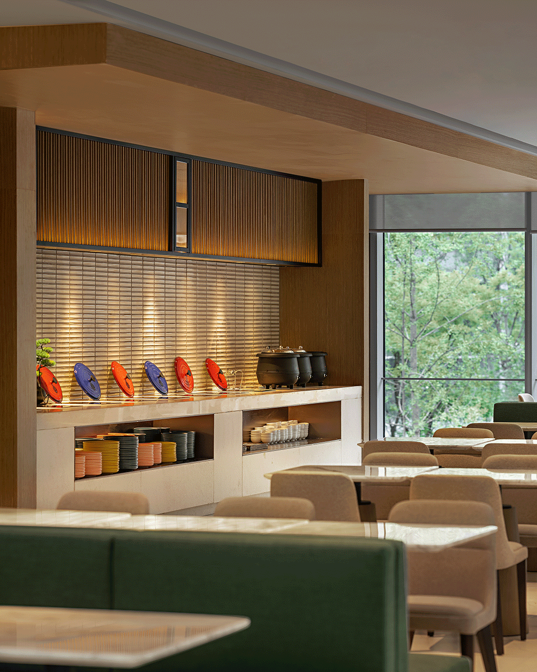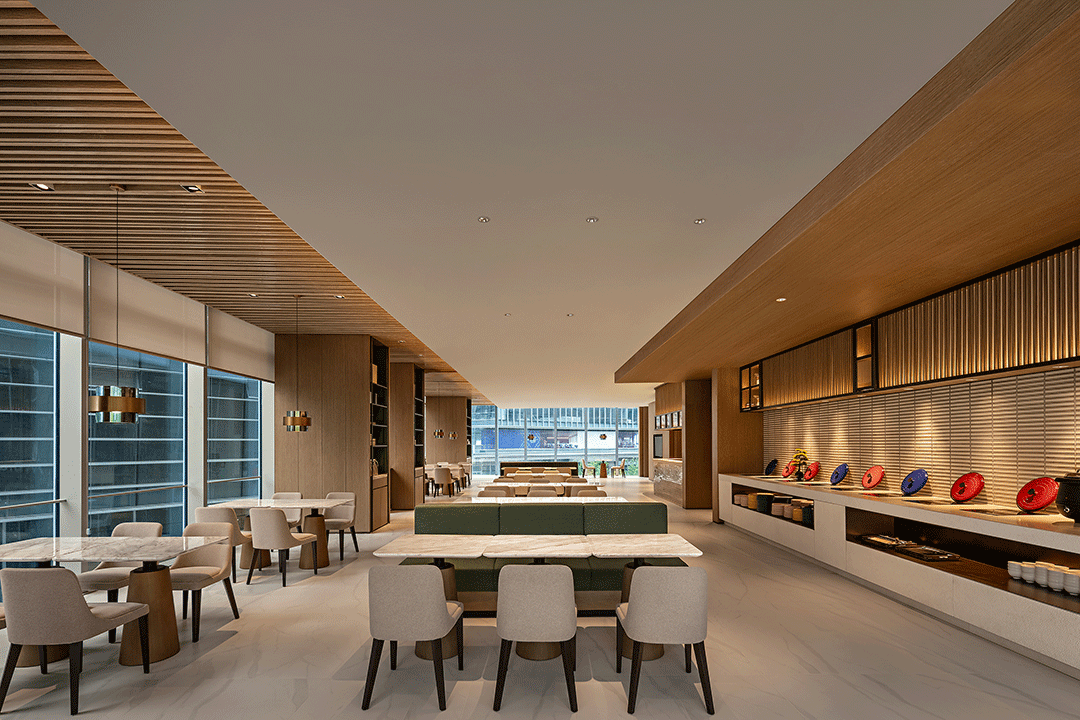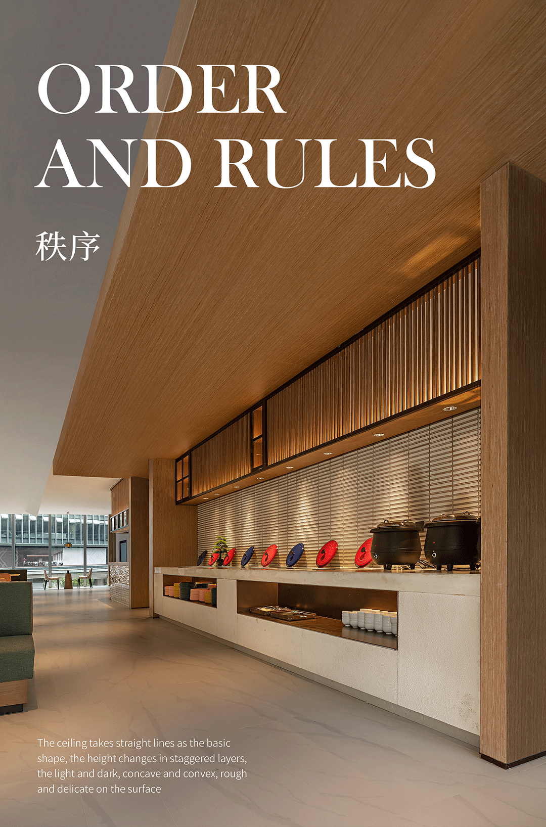 餐厅以折叠、层次自然开展,原木材质的自然感沉淀,将空间中的色彩、光晕在简约奢华中朦胧呈现,通过极具美感的几何比例的充分运用,在不同区域的层叠交错中,找寻新的平衡与美感。