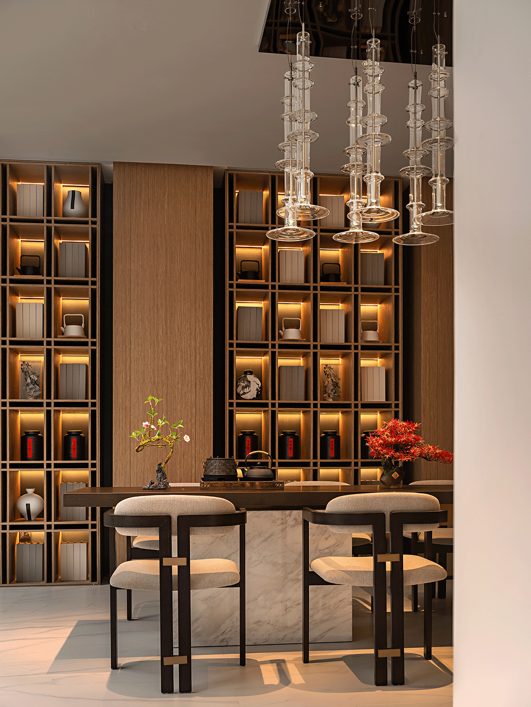 茶室极力追求室内的整体性,通过细腻的材质与陈设,巧妙地平衡空间,营造宁静雅致的格调。选址作为汉代中国茶文化的诞生地,茶客满座、茶香氤氲、高谈阔论......一派静而奢的景象。