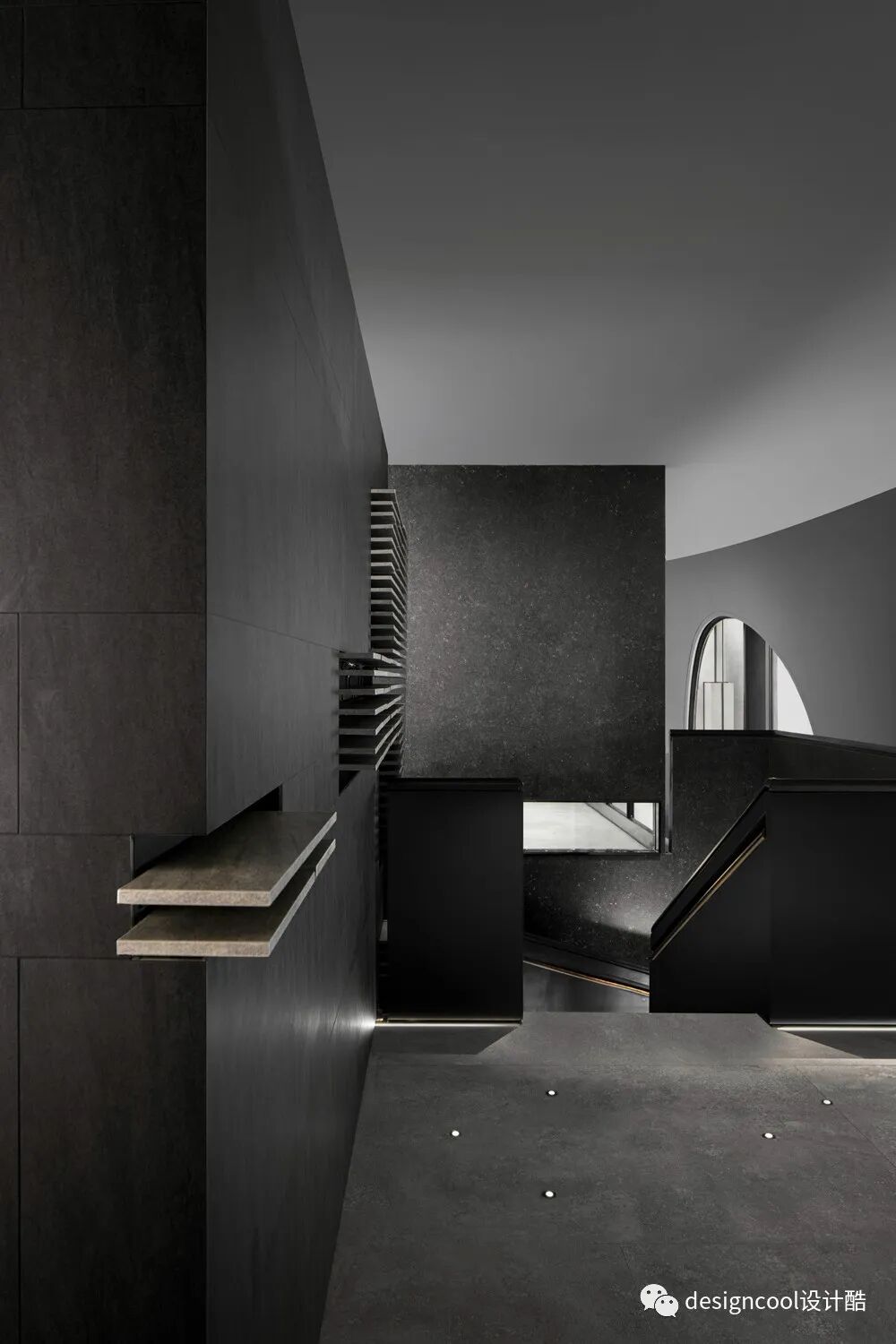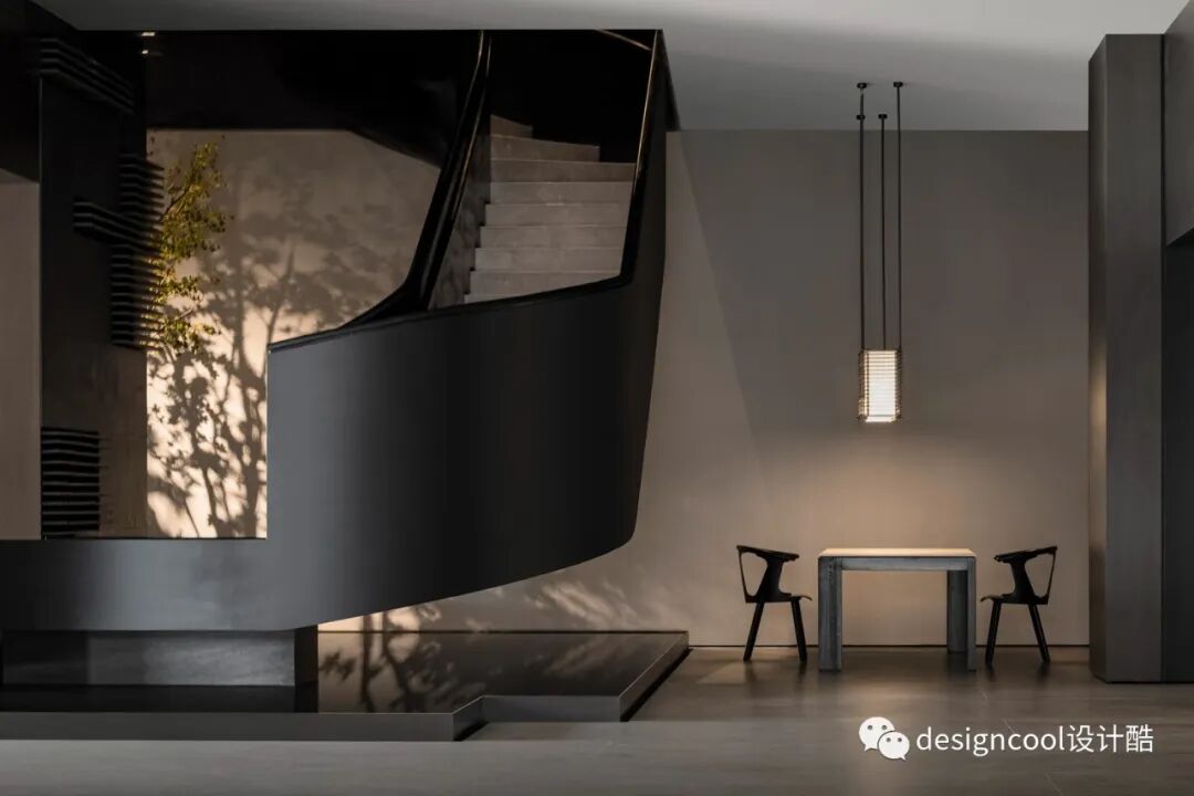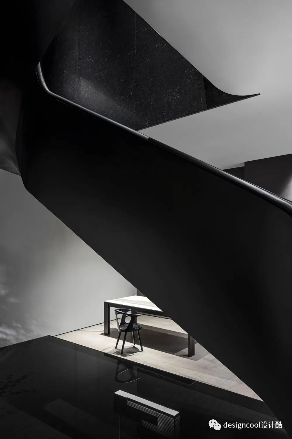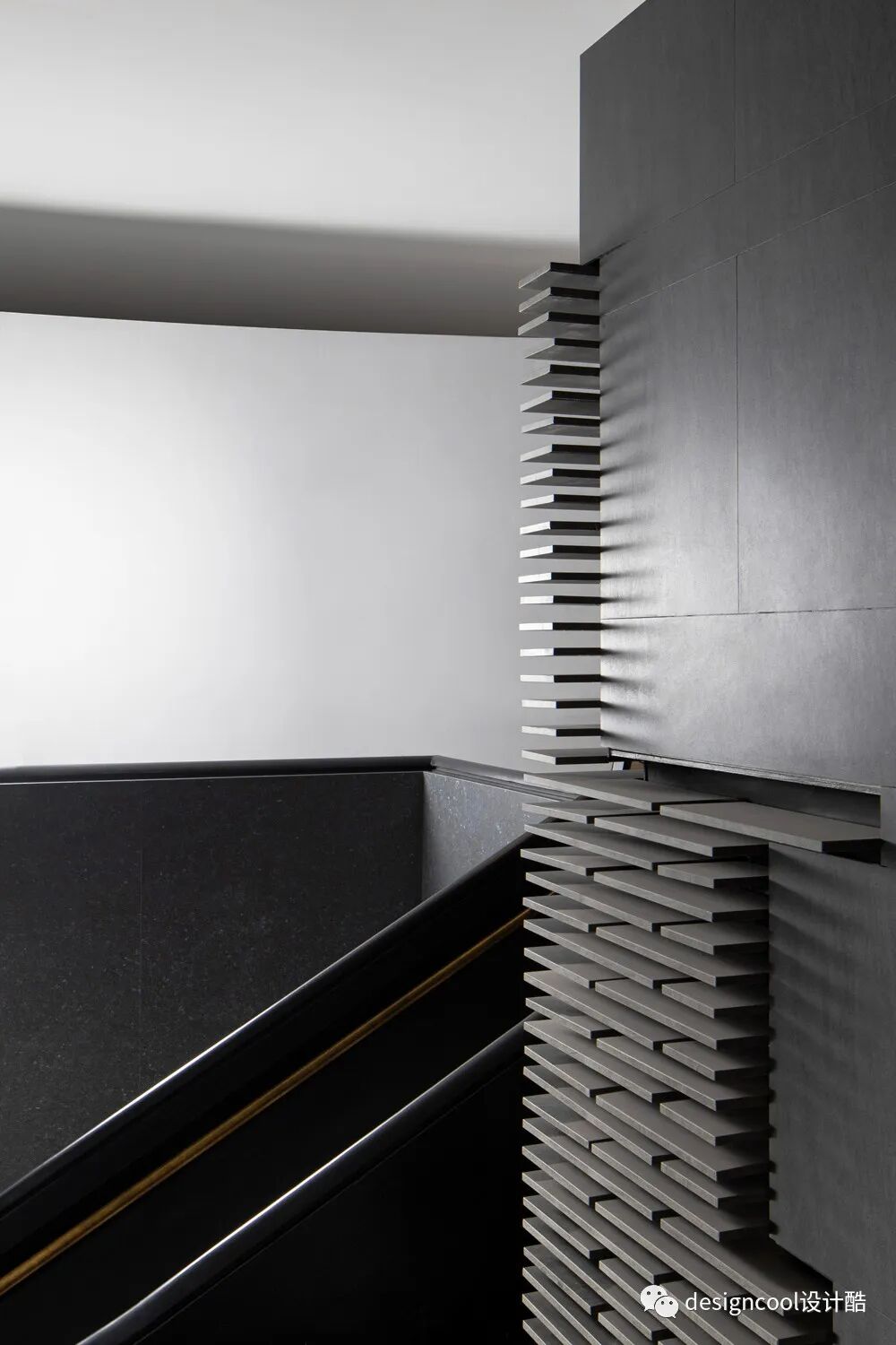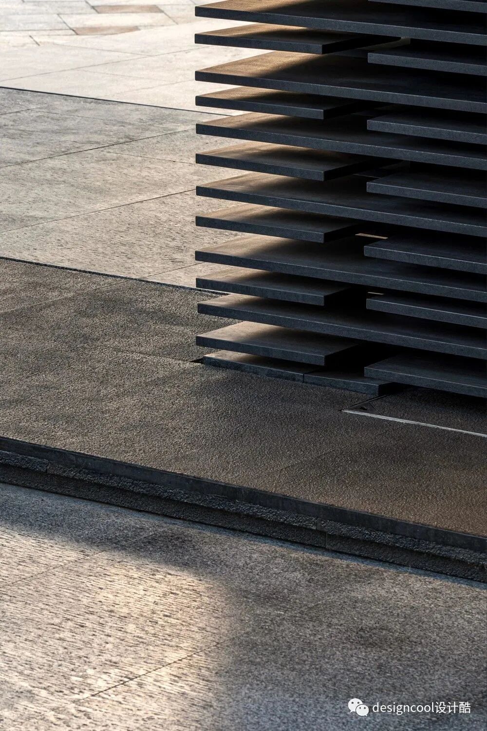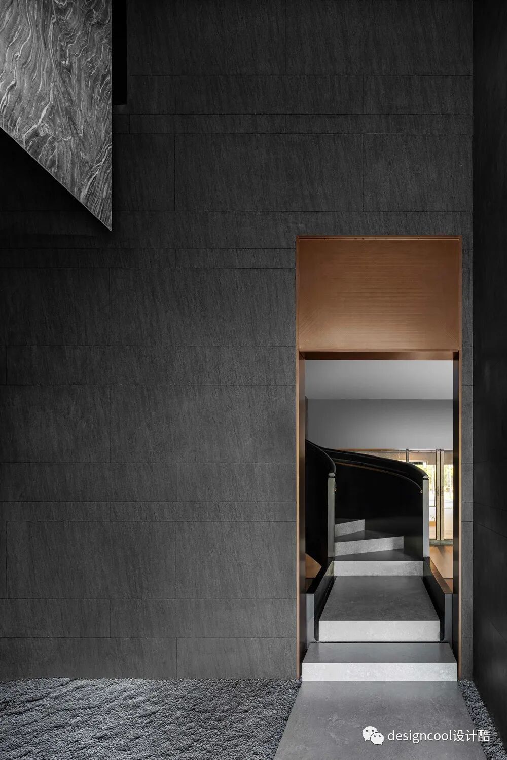 沿着玻璃幕墙向内走,由不同颜色的石板引导的低台阶将人们带进一个“方形盒子”。这是螺旋楼梯的开始,也是一个“月光宝箱”,它从原来的石头升华成了一块石板:地面上的黑色小石头,挖空的墙壁后面的树木和流水的阴影,以及悬挂在上面的巨大石板,将天和地整合成一个方形的盒子。