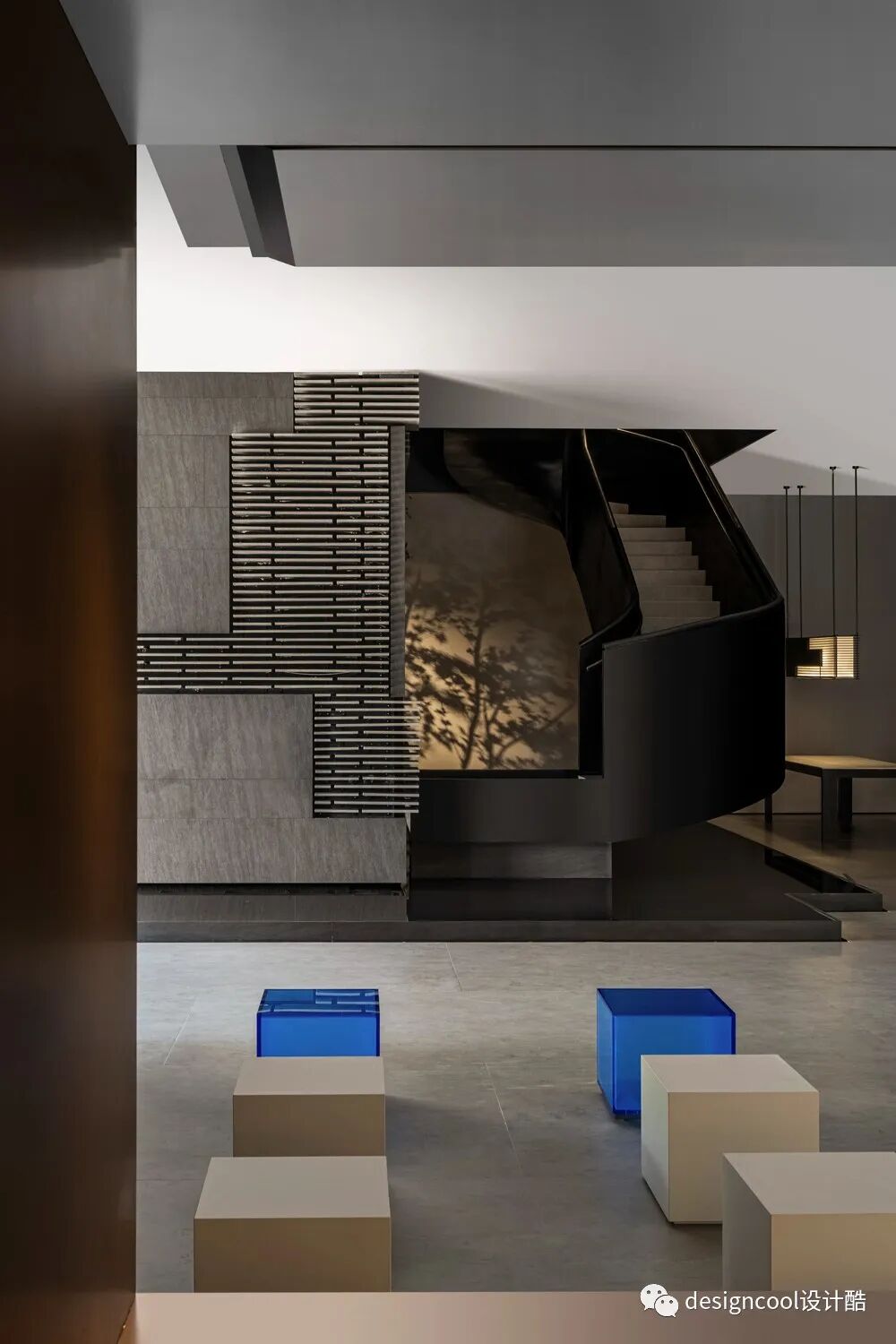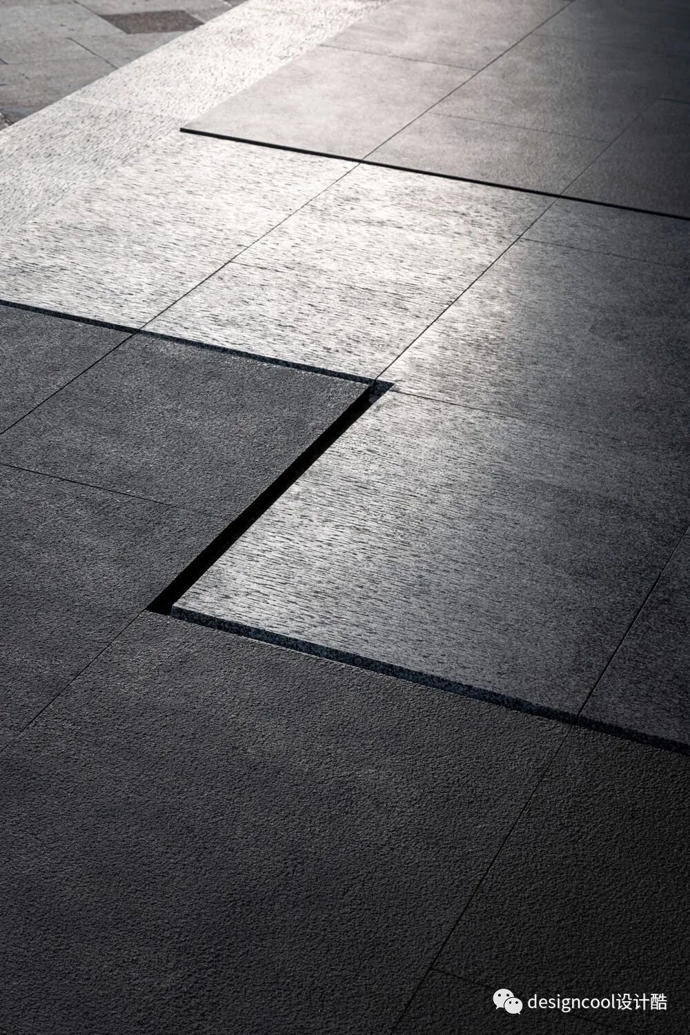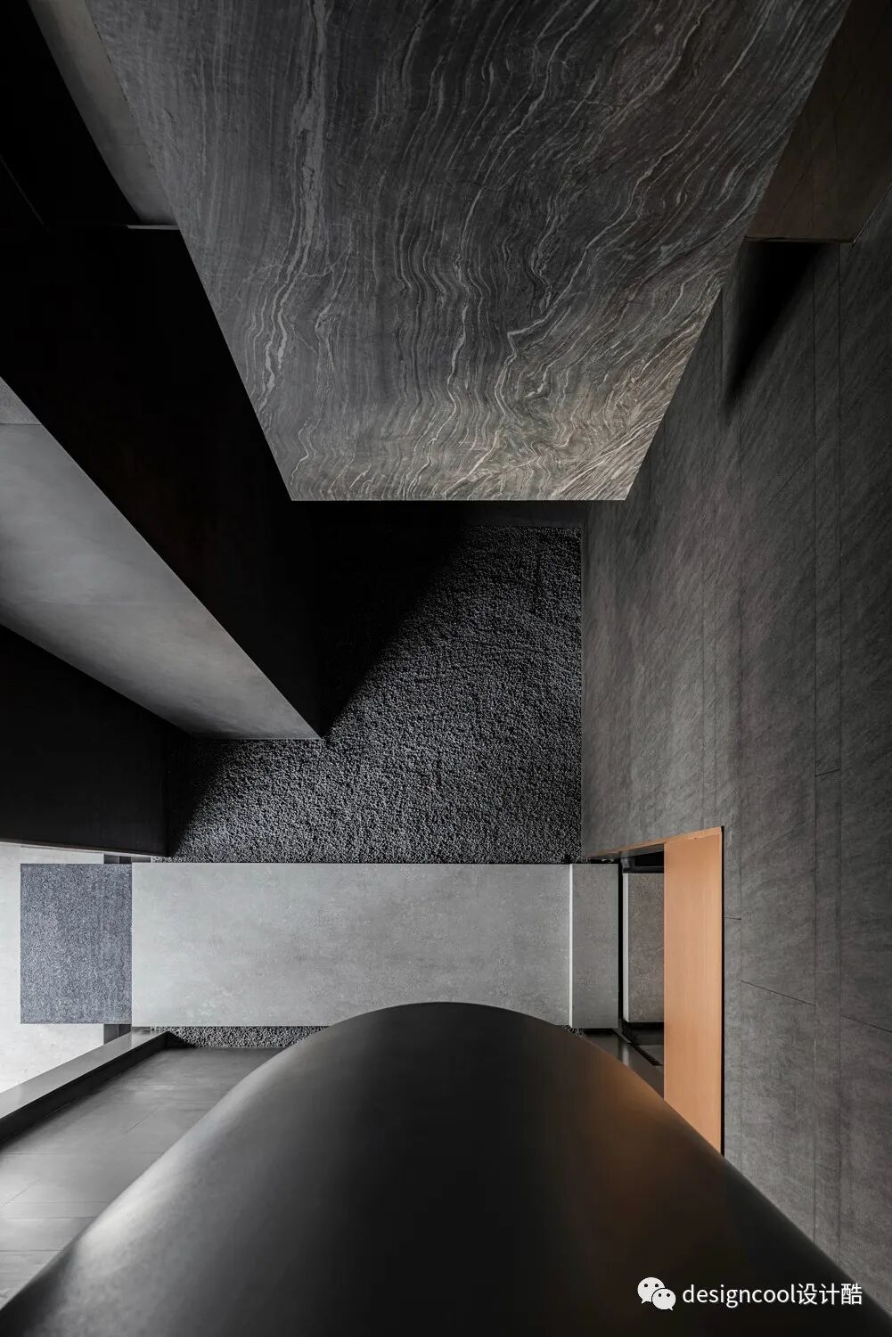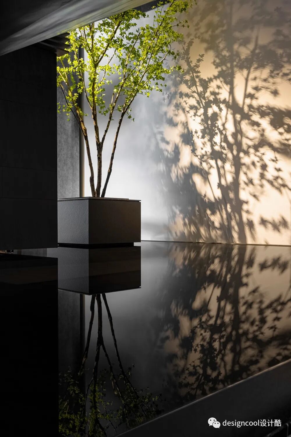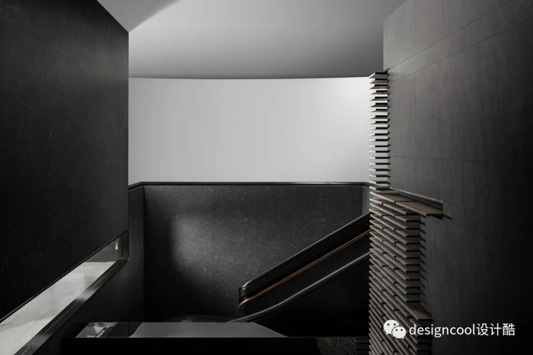 沿着玻璃幕墙向内走,由不同颜色的石板引导的低台阶将人们带进一个“方形盒子”。这是螺旋楼梯的开始,也是一个“月光宝箱”,它从原来的石头升华成了一块石板:地面上的黑色小石头,挖空的墙壁后面的树木和流水的阴影,以及悬挂在上面的巨大石板,将天和地整合成一个方形的盒子。