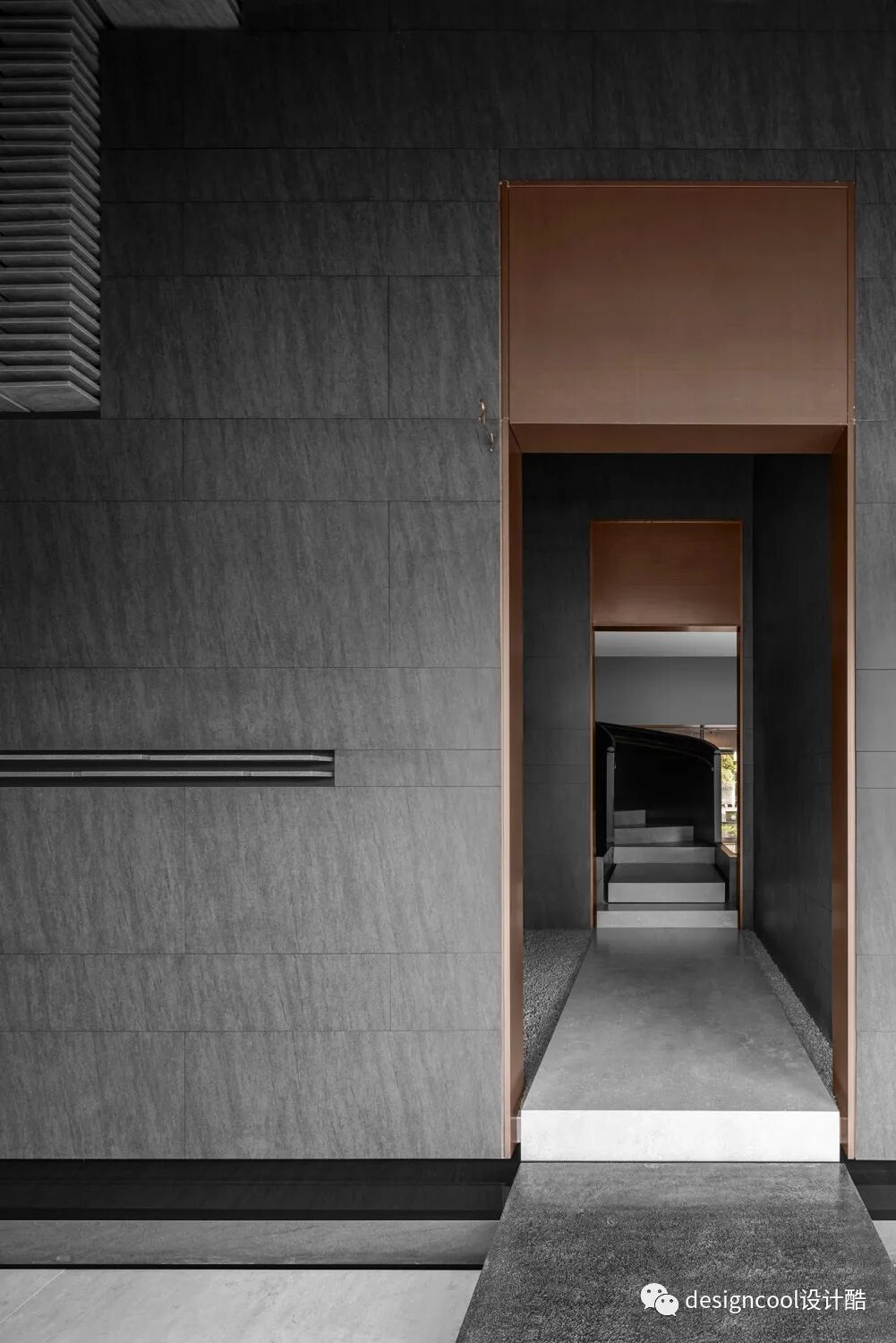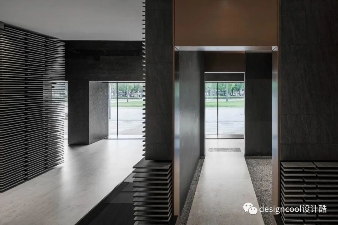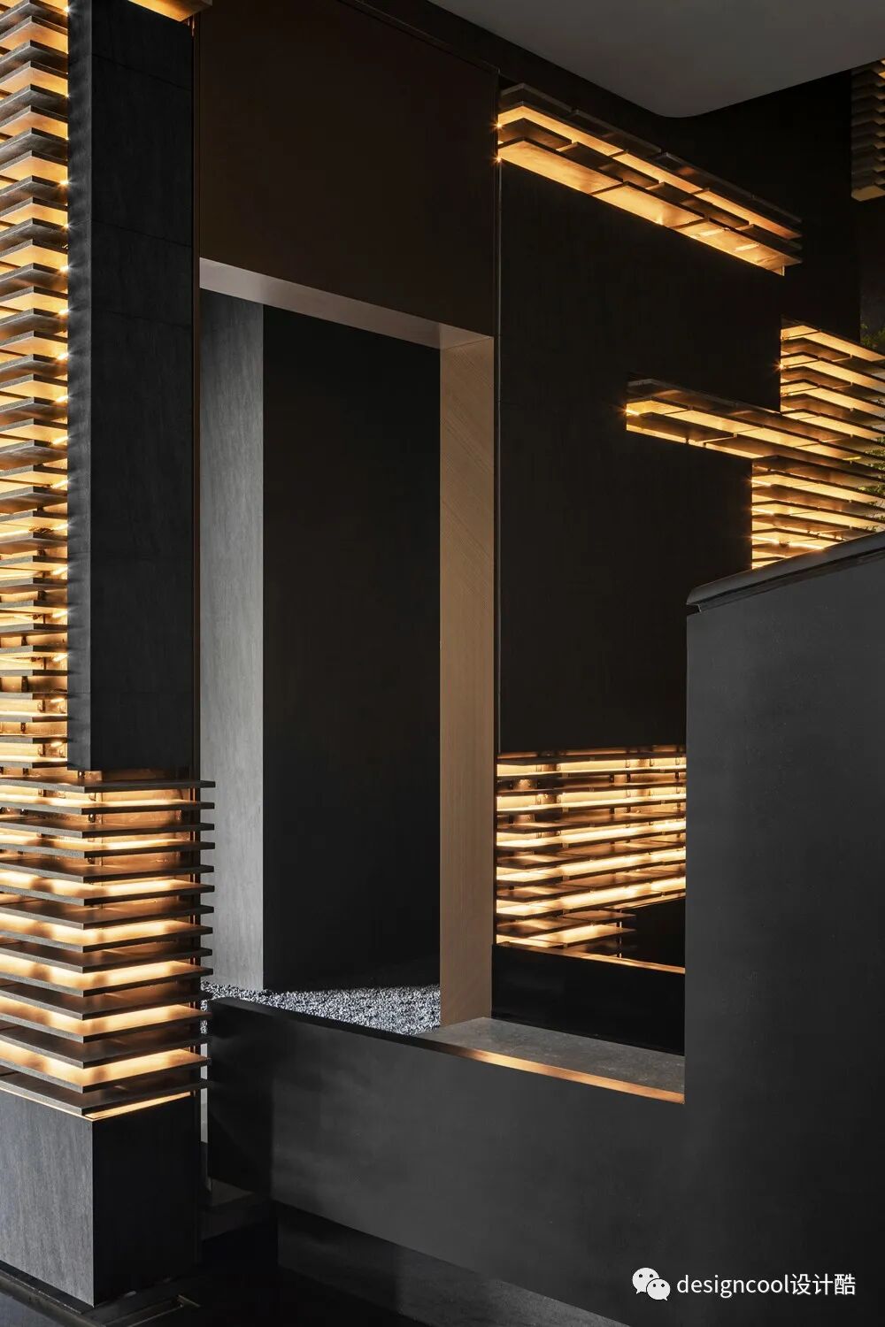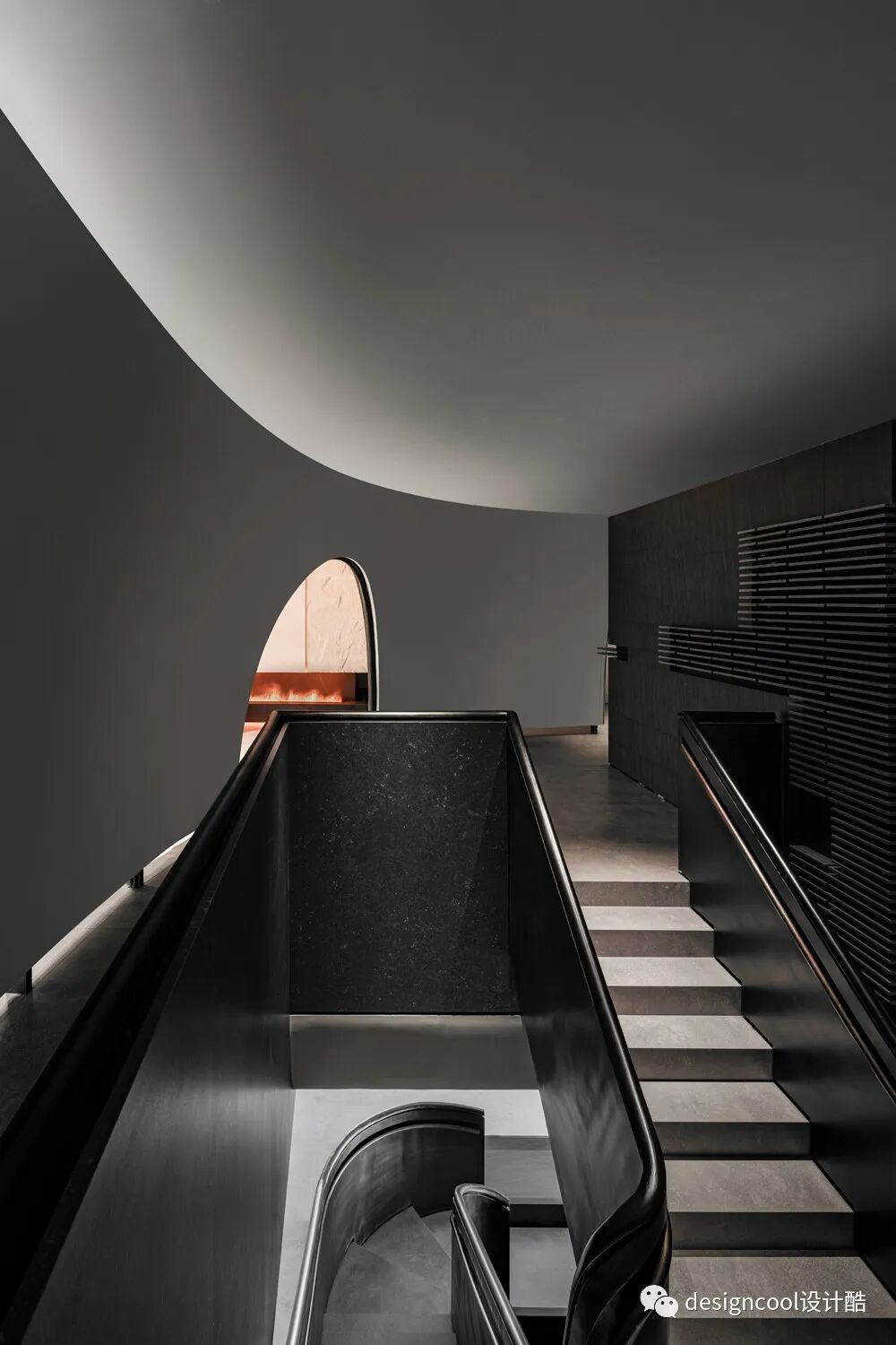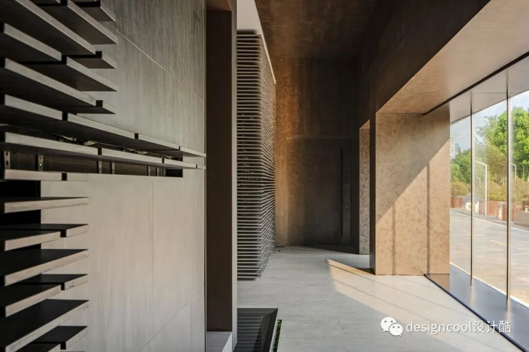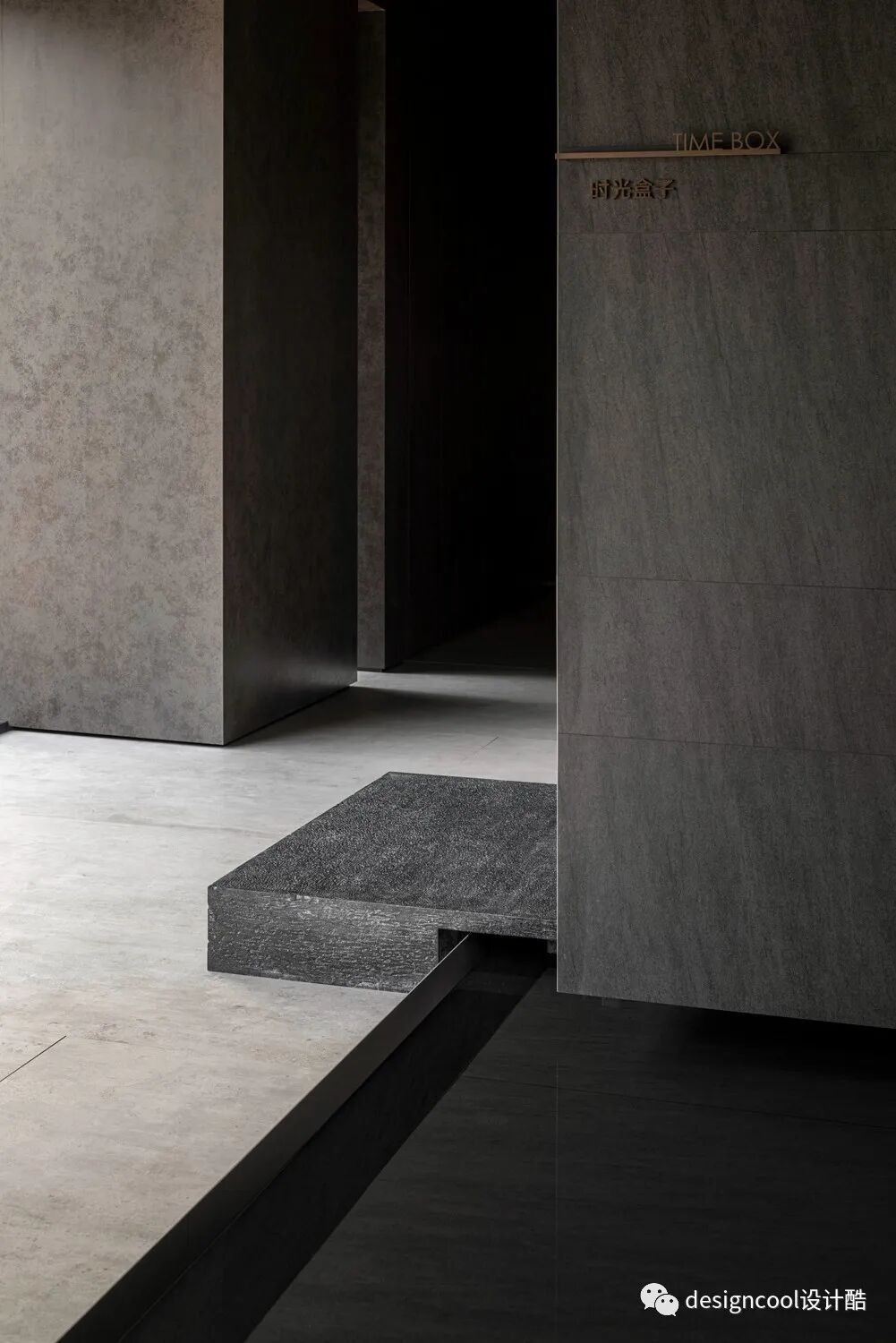 沿着玻璃幕墙向内走,由不同颜色的石板引导的低台阶将人们带进一个“方形盒子”。这是螺旋楼梯的开始,也是一个“月光宝箱”,它从原来的石头升华成了一块石板:地面上的黑色小石头,挖空的墙壁后面的树木和流水的阴影,以及悬挂在上面的巨大石板,将天和地整合成一个方形的盒子。