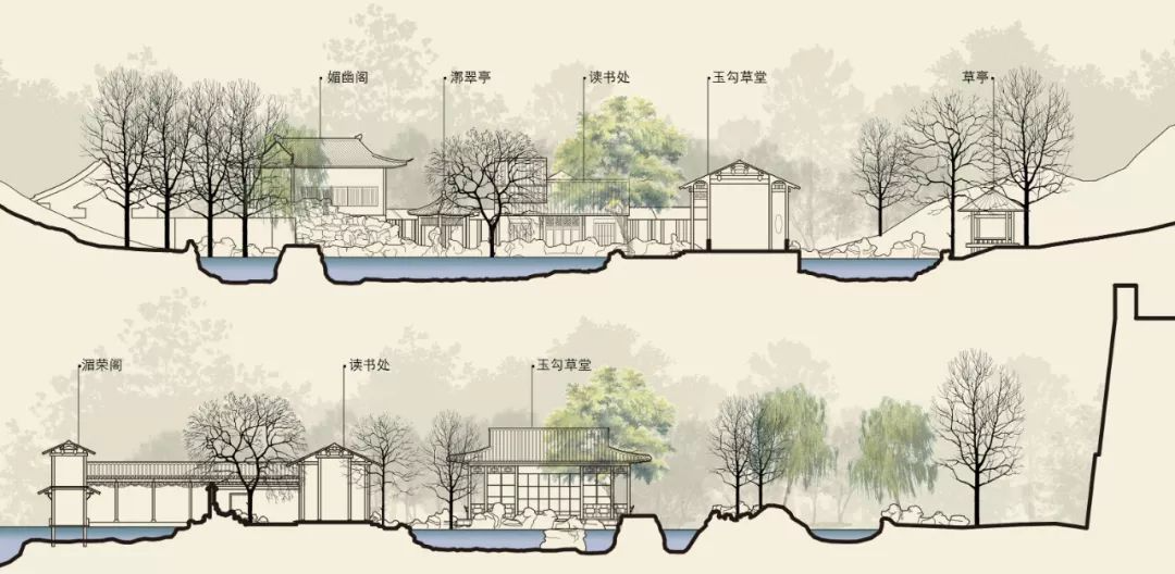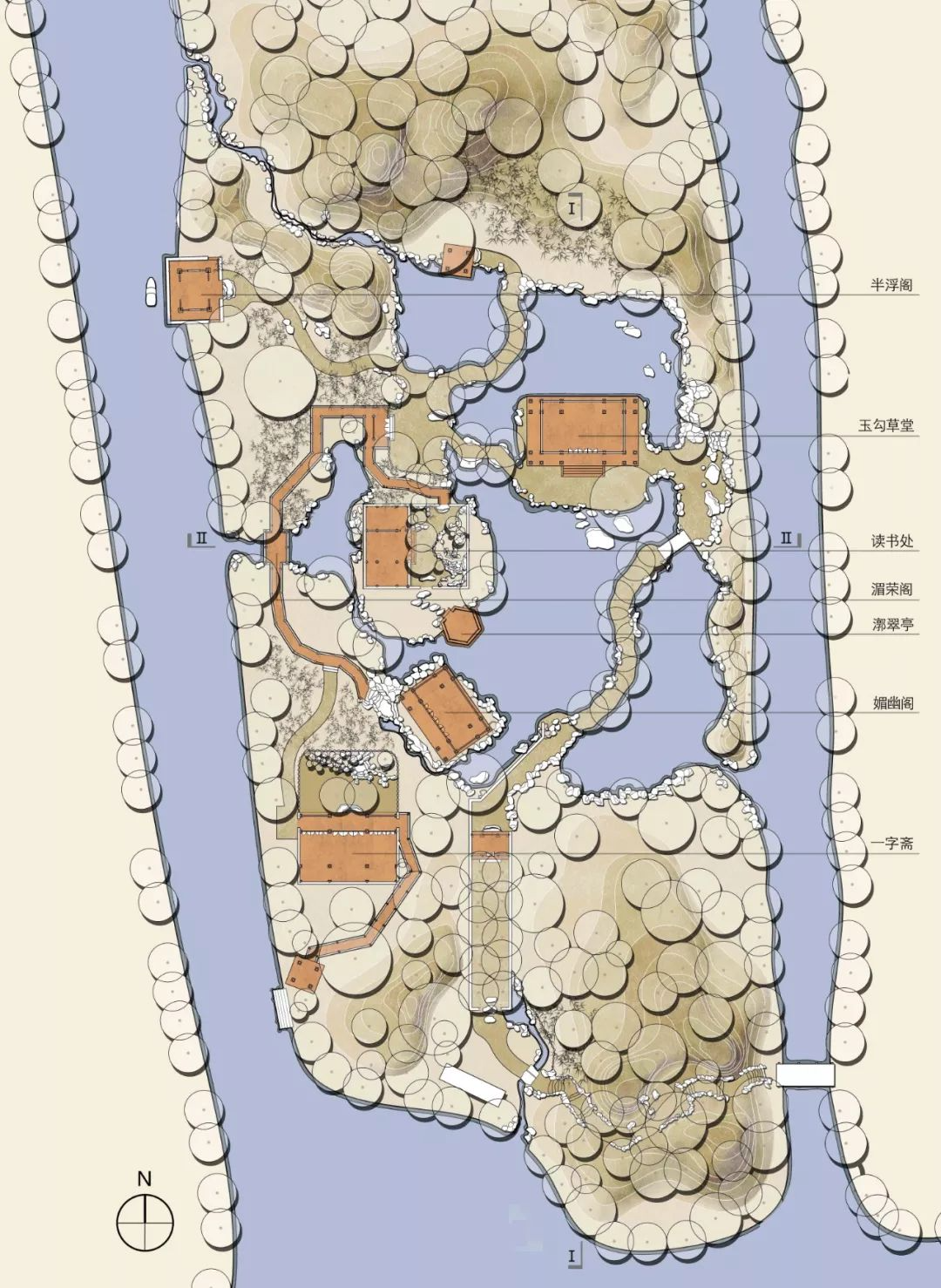 我们从平面图中能够看出,影园虽处在河水中,仍在园中挖湖理水,让园林内外的水景融为一体,模糊了园林的边界,而且园中建筑以少胜多,少用游廊,形成园中有水,水中有园的奇特体验。