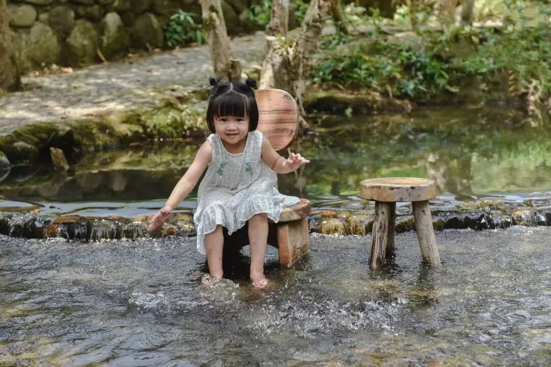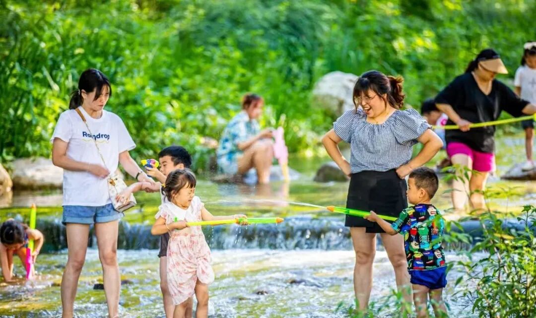 在夏日悠闲时光,大人们在广场的树荫下、凉亭中给孩子们拍照,拉扯家常,小朋友们则拿起水枪和伙伴们在婉转清澈的水线中追逐戏耍,大家各得其乐。