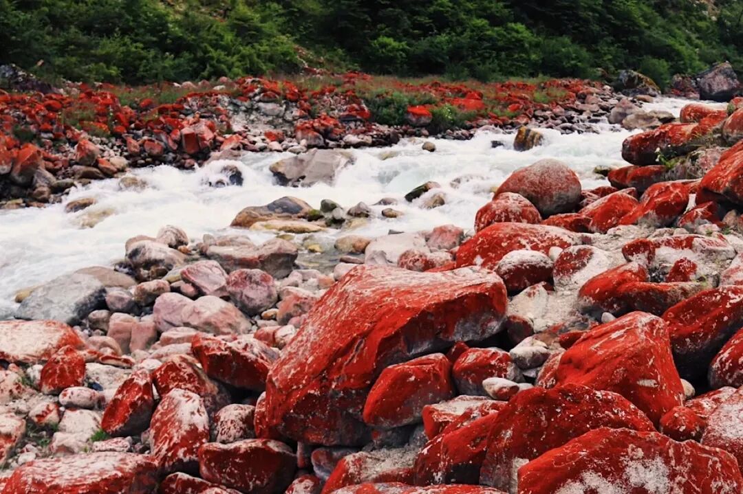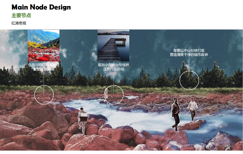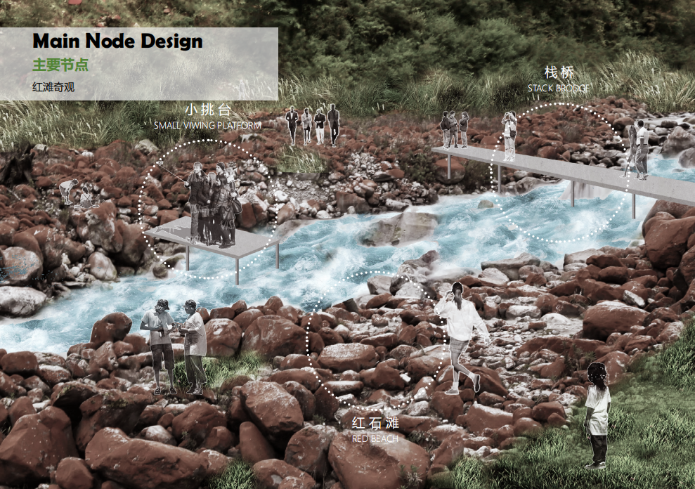 35号方案创造性的把色彩元素同水系相结合,为我们呈现出具有贡嘎特色的“红石滩”,野趣感十足。