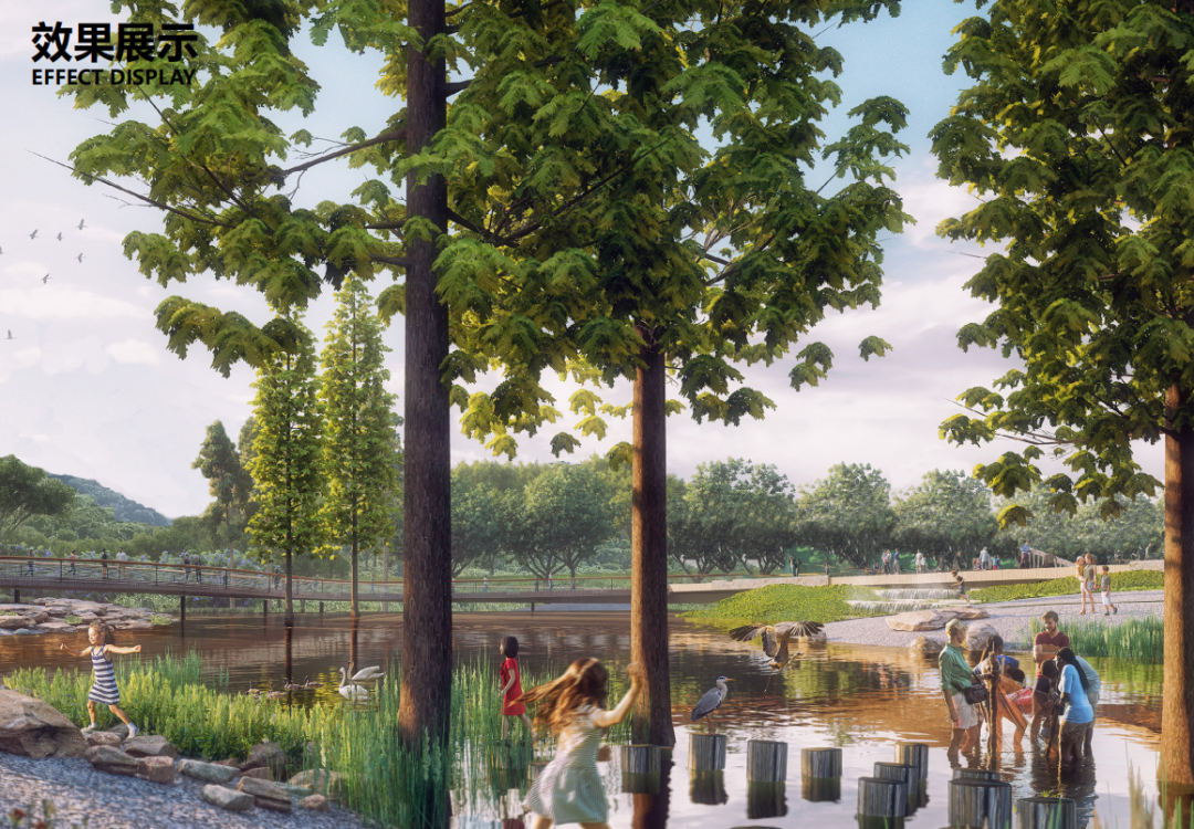 林边还设计了可以溯溪游玩的浅滩,小朋友们可以在这里用网兜捞小鱼,捉蝌蚪,体验浮瓜沉李的乐趣。