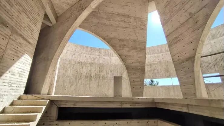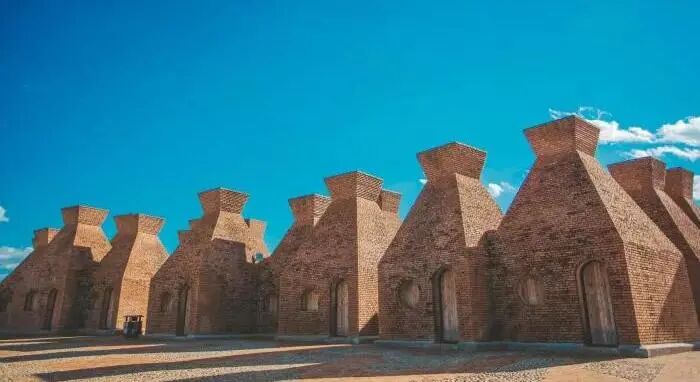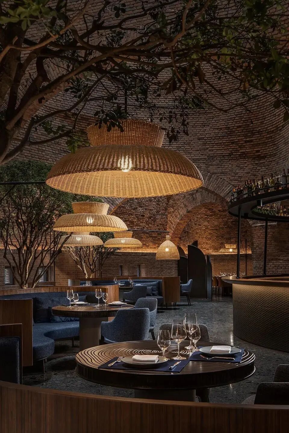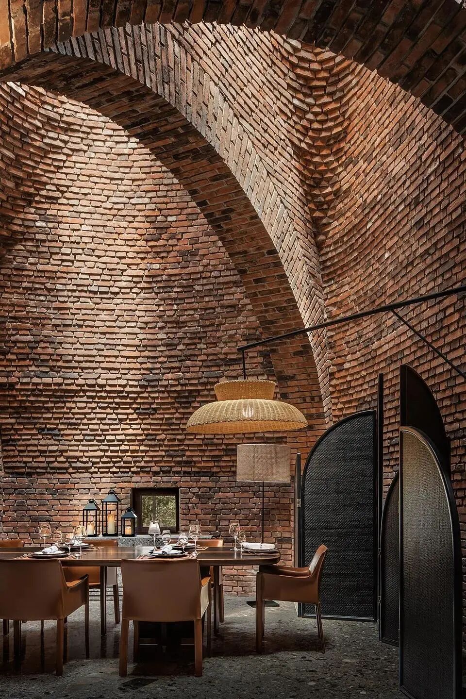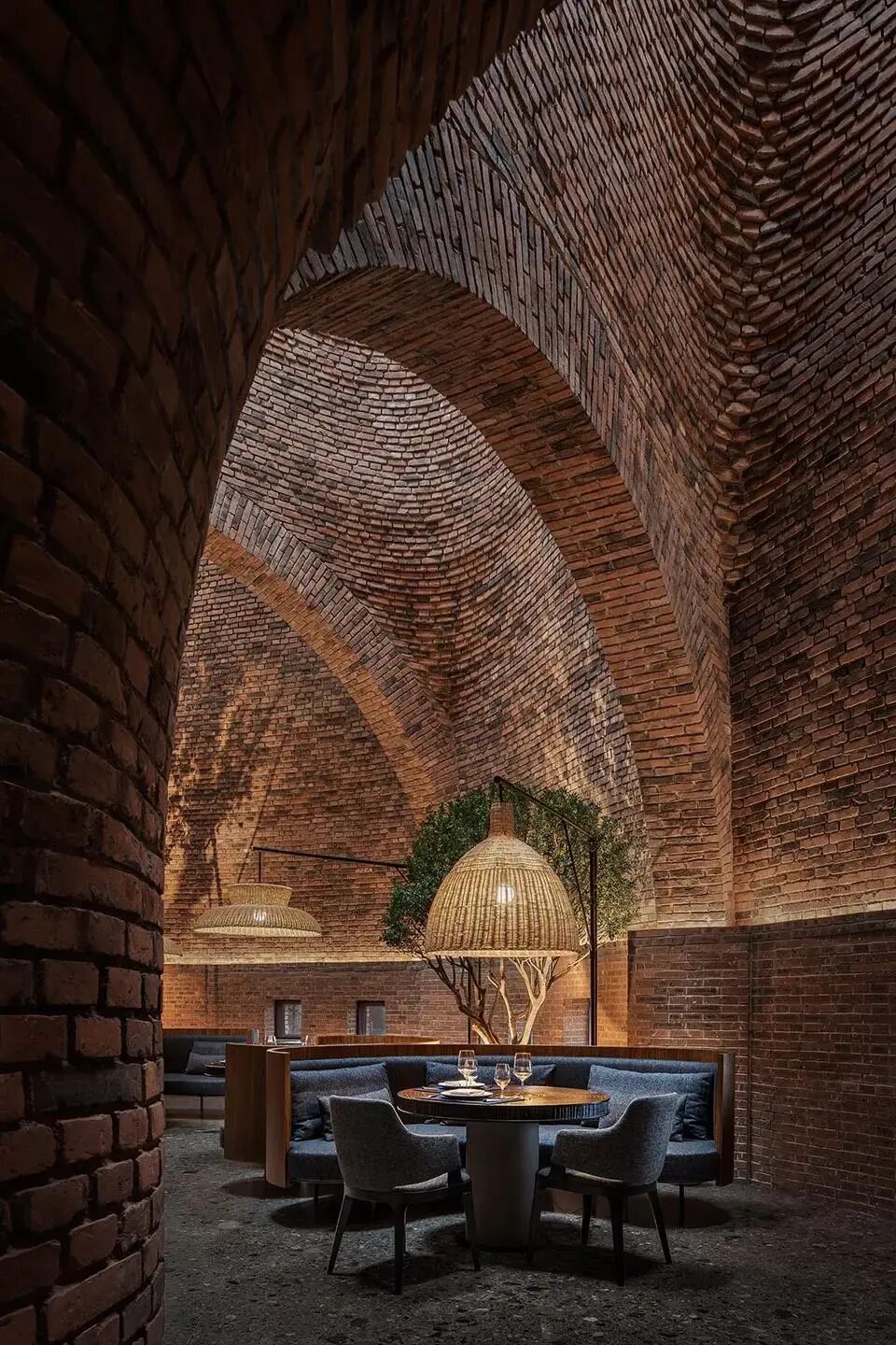 建筑体全部由当地的红砖建造而成,未使用一根钢筋、一颗钉子。自然光沿着高挑的穹顶曲线,被巧妙引入就餐环境。