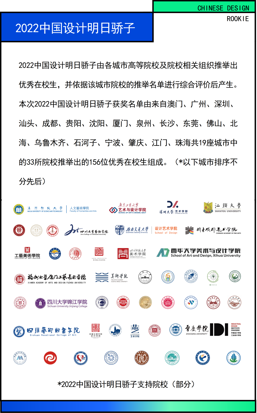 在此热烈祝贺以上获奖的2022中国设计明日骄子!2022中国设计明日骄子与莘莘学子一路同行,见证他们以灵感为梦,手握未来的蓝图,坚持用艺术做到青春不设限。未来由你,期待尽情出彩!