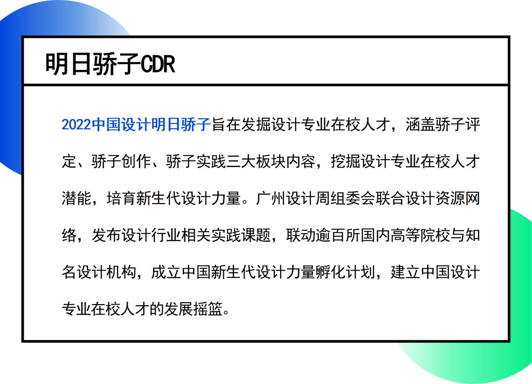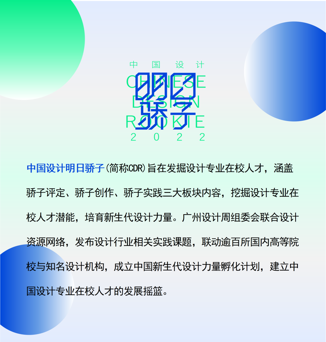 2022中国设计明日骄子涵盖骄子评定、骄子创作、 骄子实践三大板块内容,广州设计周将面向行业机构、企业征集实习实践需求,并面向以上获得明日骄子的在校生和毕业生发布实习实践工作机会,由明日骄子根据自身需求参与实习或实践创作。