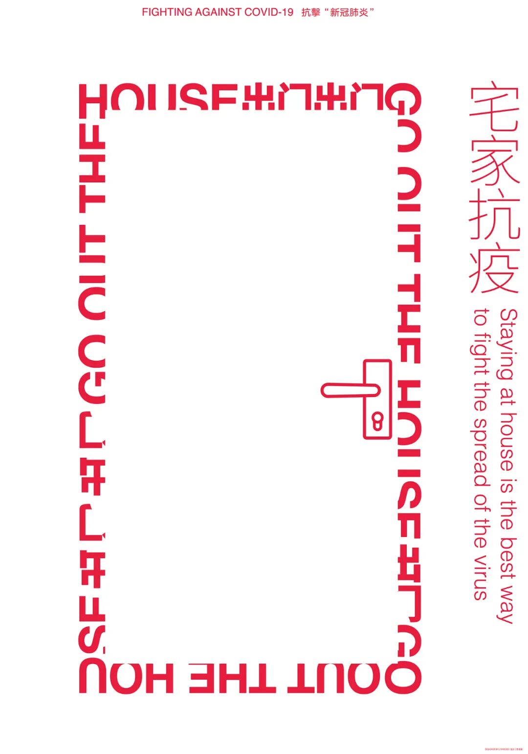 李英伟:确实是,近两三年最常见的状态就是居家。在疫情肆虐的时期,相信设计师们都想用自己的手段表达一下对疫情的态度,与疫情相关的设计展览也相应的多起来。这张海报是应邀参加呼吸·共生——2020全球抗击疫情国际平面设计展而设计的,同时又收到战疫情·武汉能——2020抗击“新冠肺炎”公益宣传设计全球活动;城市的温度——2020“抗疫”专题公益海报邀请展;2020台湾全球防疫国际平面设计公益展等海报展的邀请。海报设计最初的想法是用“计白当黑”的创造法则来体现,也是想做的简洁一些,过程中极力促成最初的想法。画面上用“出门Go out the house”围起来一个门形的文字方框,在上面放一个白色的门板,门板把文字压住一部分,使“出门Go out the house”呈现出一半的画面,实际上就是不能出门的意象,白色的门板上加了门把手,这样就一目了然啦。因为这件海报是2020年创作的,以当时对新冠病毒的了解和认识,大家尽量不出门,宅家抗疫,是当时认为行之有效的方法。