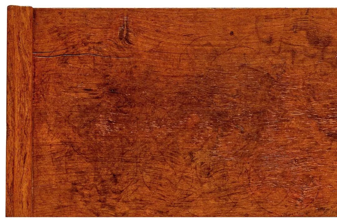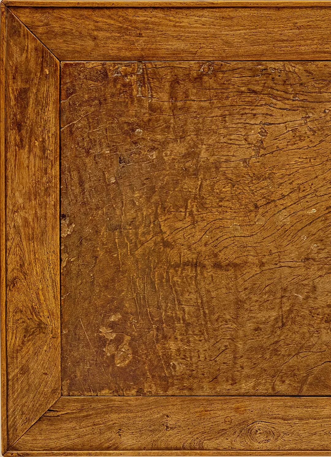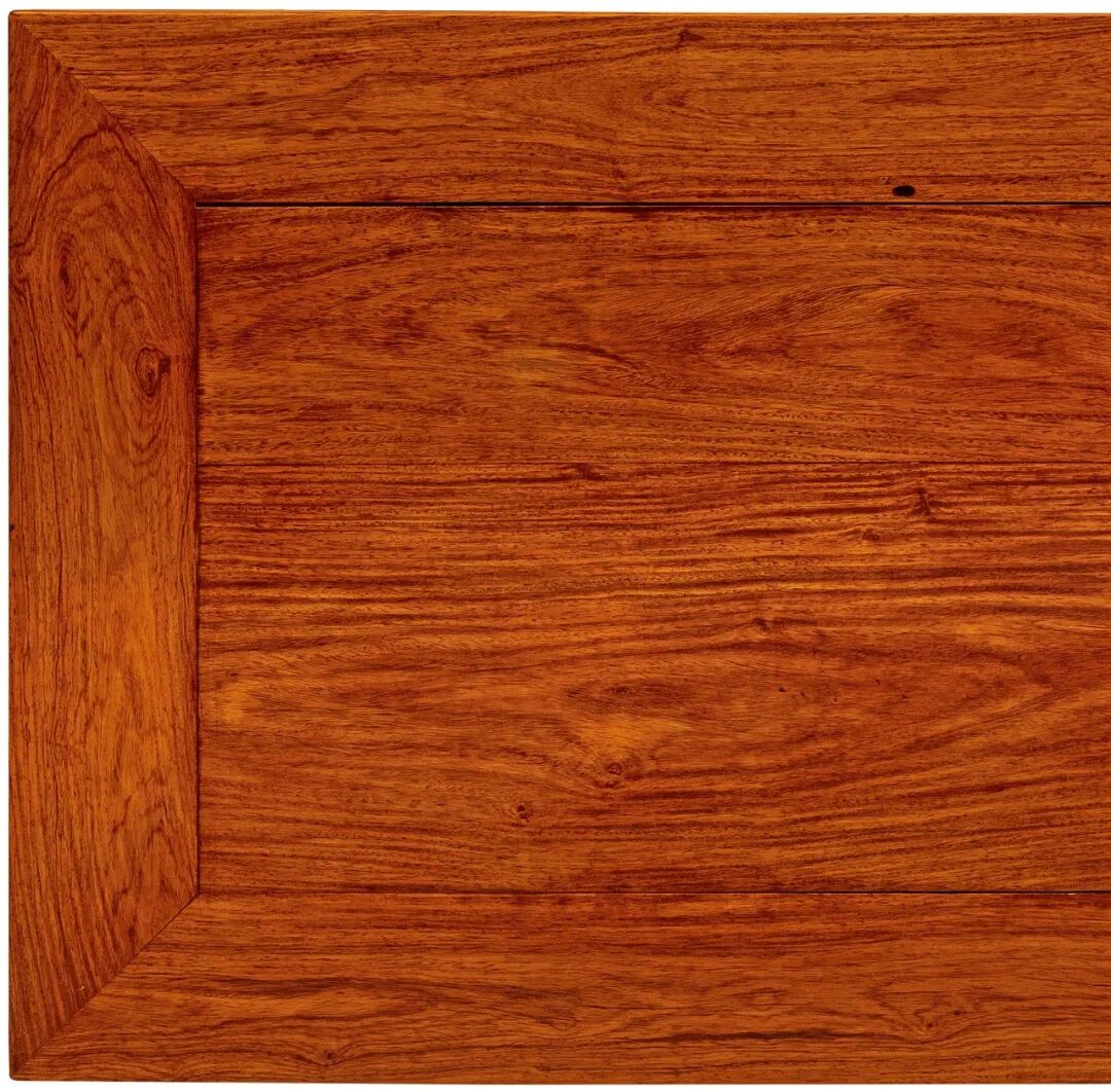 此案黄花梨制,用材厚重,纹密质坚,包浆和色泽红润。案面为独板,长近两米,宽逾四十五公分,纹理致密细腻,莹洁雅致。清代《则例》称独板面做法为“一块玉”,由此案观之,真如玉板天成,温润宜人。
