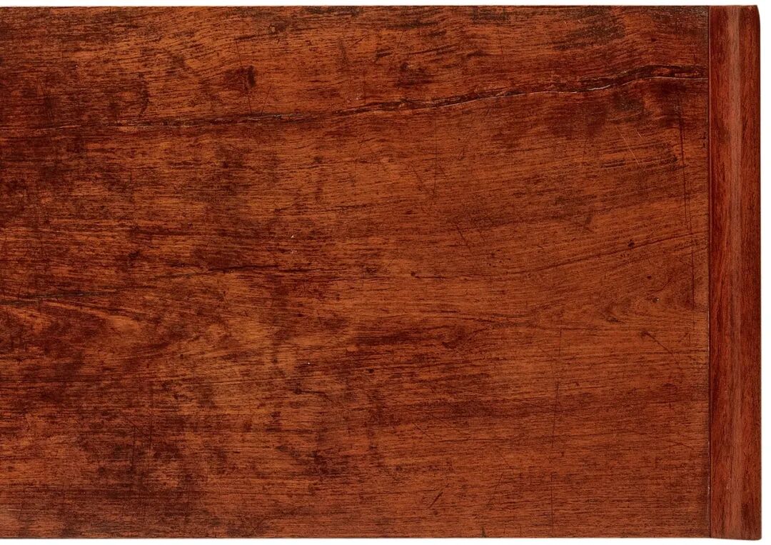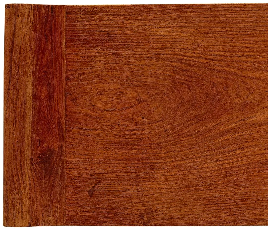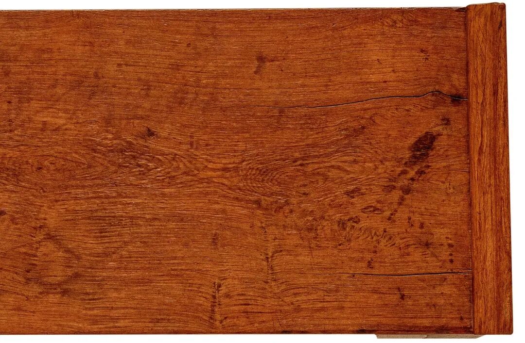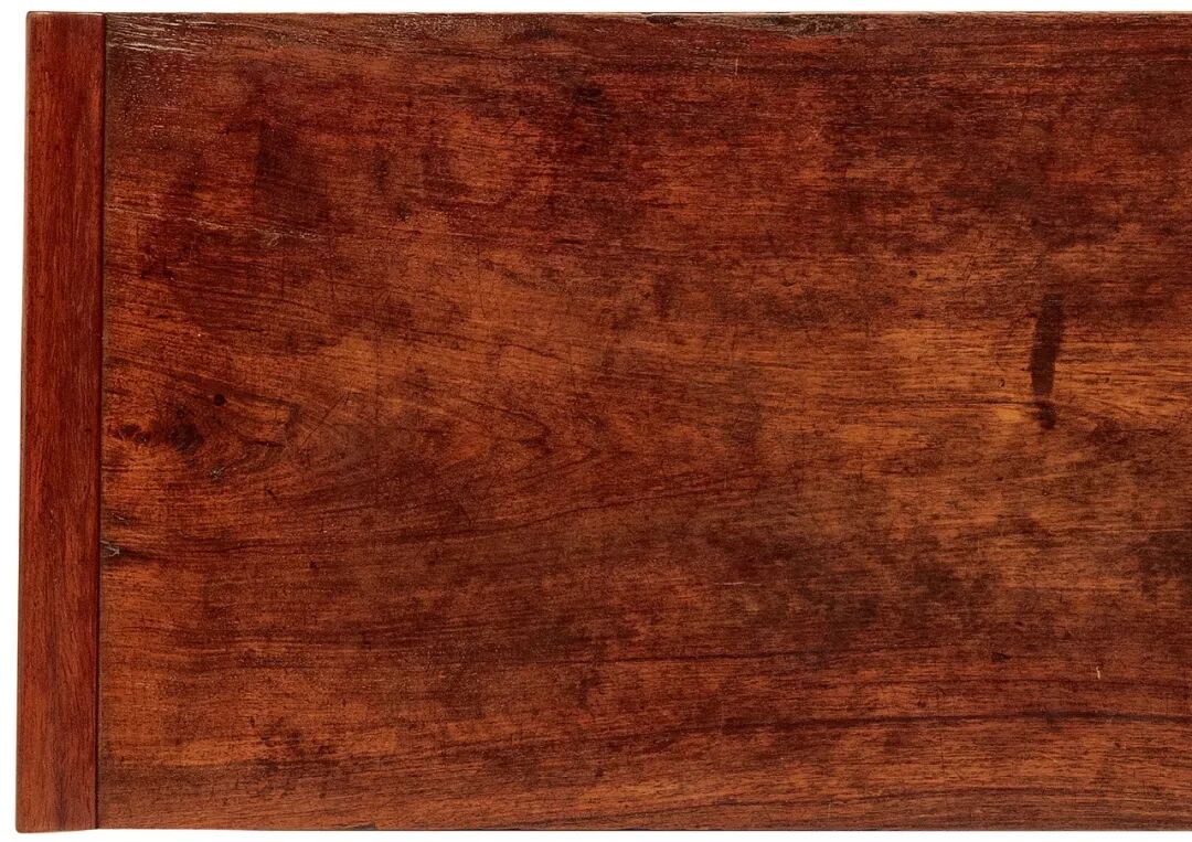 此案黄花梨制,用材厚重,纹密质坚,包浆和色泽红润。案面为独板,长近两米,宽逾四十五公分,纹理致密细腻,莹洁雅致。清代《则例》称独板面做法为“一块玉”,由此案观之,真如玉板天成,温润宜人。