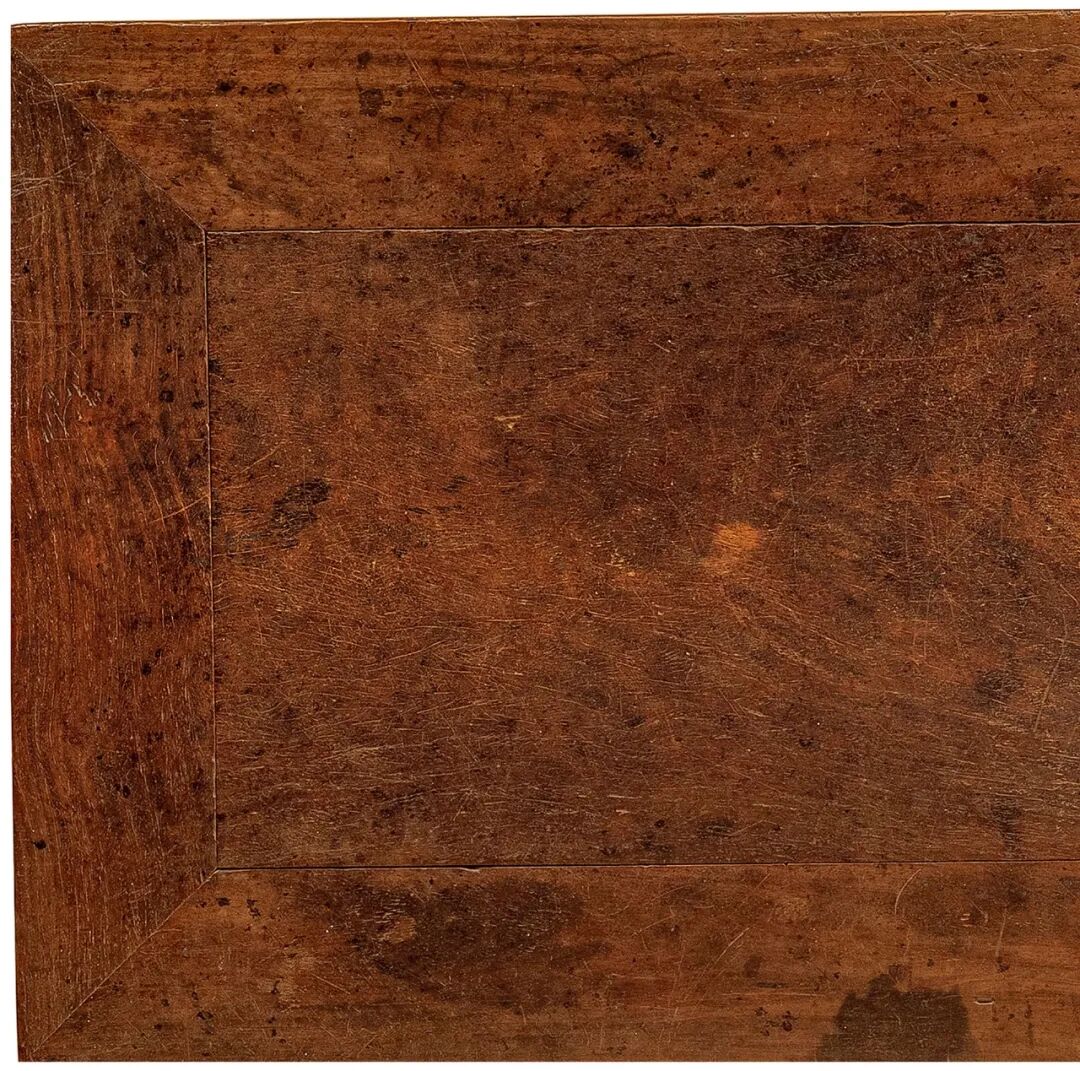 此画案刀牙板、梯子枨、圆腿,是典型的明式风格。朴质简练,平淡耐看,为其特色,然硕大的体型,却是少见。黄花梨独板板心,以格角榫攒框镶嵌,面下有七根穿带以支承,冰盘沿线脚。直牙条、素牙头,厚重的圆腿足,以夹头榫与桌面相接,侧面两横枨,亦为圆材。其雅致大方的造型、精细的工艺,正是明式家具成熟期的表现,而明式家具的鼎盛又与江南文人关系密切。