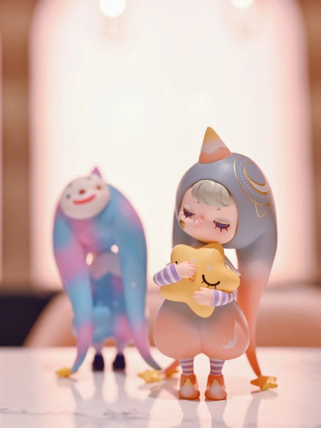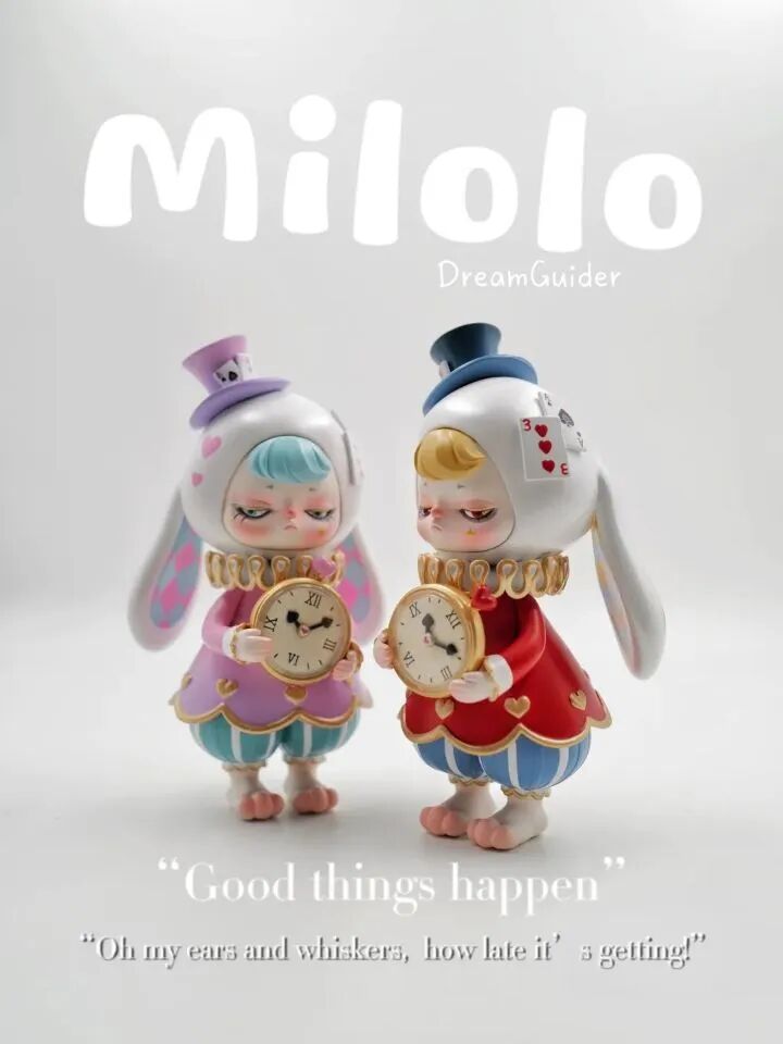 她最开始做的是BJD球形关节人偶,主打小尺寸,看起来和现在的潮玩很相似,后来她便开始接触市场主流的潮玩。经过慢慢地了解和学习探索,2020年以后她正式转型往潮玩方向发展,创作了潮玩IP——“Milolo”系列。