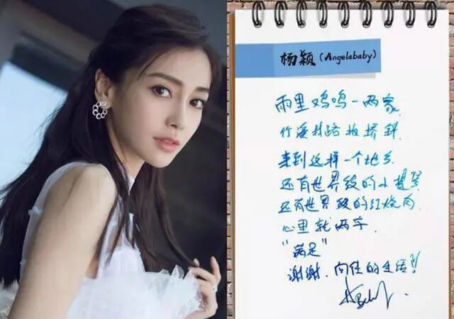 这是杨颖的字,和鹿晗的字属同一类,都是比较有韵律感。这类人其实是有一定的书法天赋的,如果能抽空临帖的话,会比多数人更有建树。