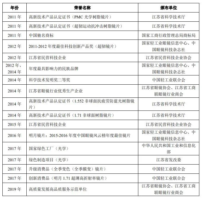 公开资料显示,明月镜片是一家综合类眼镜镜片生产商,拥有“明月镜片”的品牌,其业务涵盖树脂原料的研发、生产及销售,镜片光学结构、光学膜层及功能化镜片的研发及设计,树脂镜片大规模工业化生产及个性化定制生产,镜架设计及成镜的生产、销售。