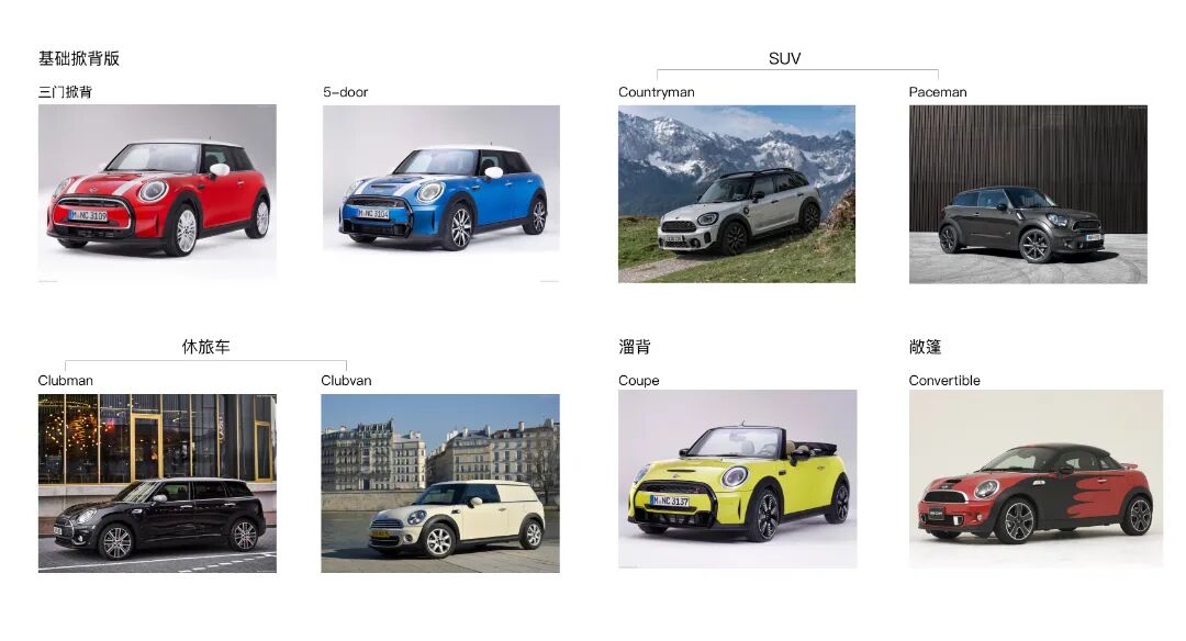 在回顾历史之前,让我们先聚焦于现在MINI,了解一下MINI的产品“家谱”。大家经常能听到MINI Cooper这个名字,但其实Cooper并不是MINI的一个车型,而是性能序列(就好像奥迪有S4,RS4一样);除此之外还有clubman,clubvan什么的后缀,下面就来详细讲解一下MINI品牌下所有的车型序列和命名规则。