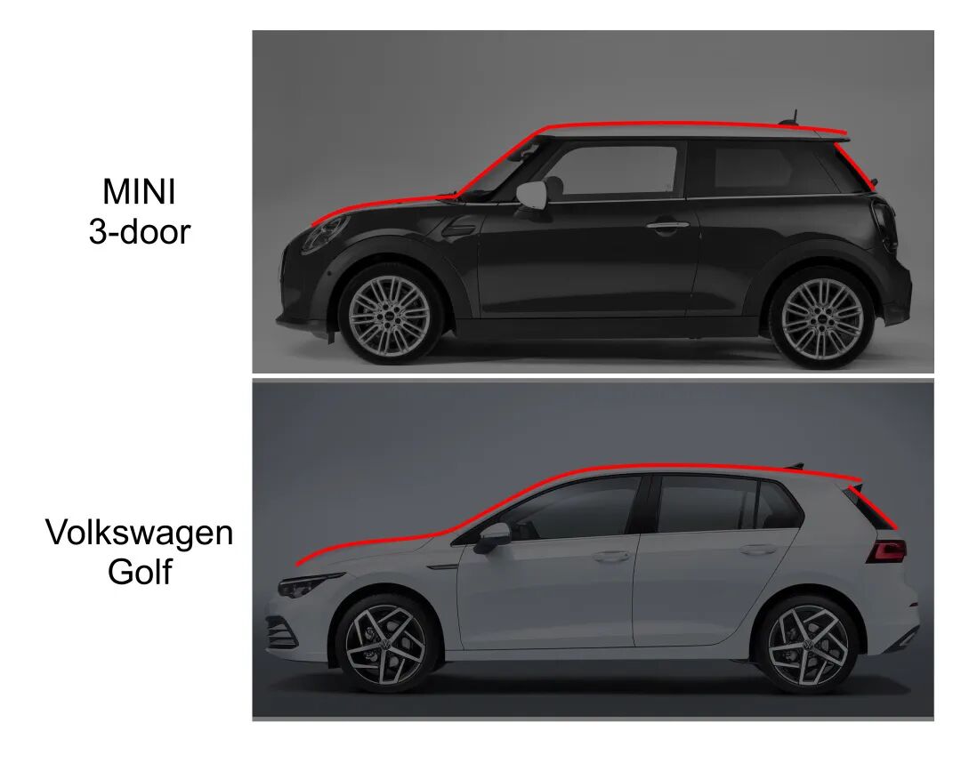 首先是复古风格,这可以说是MINI最与众不同的地方。营造复古风格不单单是对上一代车型的设计元素继承(很多历史悠久的车都会传承一些设计元素),MINI在很多方面都有精妙的考究。一辆车外观最重要的就是整车姿态,MINI相比于一般两厢车(姑且可以把MINI归类为两厢车),车顶轮廓线的处理非常有特点。如图15,我们以最常见的两厢车高尔夫举例,现在的两厢车,从引擎盖到A柱,再到车顶过渡到C柱,都会处理得非常“顺滑”,A柱和C柱非常倾斜,和车顶及引擎盖之间也有很长的过渡区域,彷佛“一笔画成的”;而MINI则A柱和C柱非常的“立”,与引擎盖和车顶的关系也“棱角清晰”,这些正是上世纪60年代以前车辆的共同特点。