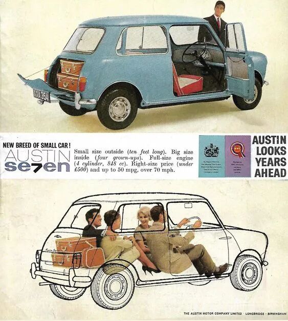 图9 早年Austin 7的广告海报,突出一个“小又能装”