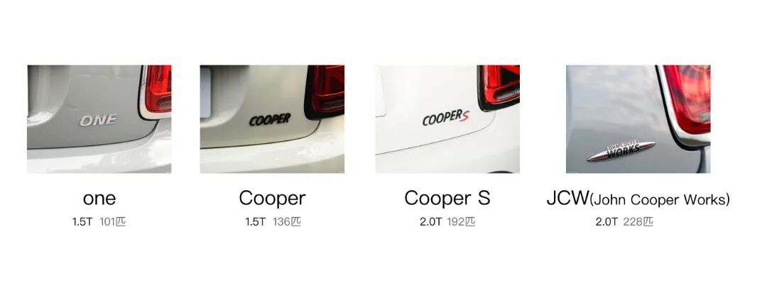 首先从性能序列讲起。在MINI的命名体系下,按照性能从低向高排列依次是One,Cooper,Cooper S,JCW。其中one就是最基础的版本,对应当下在售的MINI就是1.5T低功率版本,很多时候基础车型叫的时候大家不会带上one,不过如果你去车屁股那里看的话还是会有个one字。Cooper就是比one稍强一点的,对应1.5T高功率版本;再往上就是Cooper S,发动机也变成了2.0T;MINI的最强性能车型尾部会被贴上JCW的标识,同时车身会加上两条运动感十足的赛车拉花,对应2.0T的高功率版本,峰值马力230匹,搭配轻巧的车身和灵活的底盘,让其也获得了小钢炮的标签。
