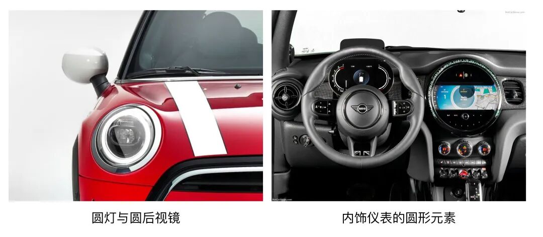 最后到细节,MINI上运用了大量的简单几何形状的设计元素,尤其是圆形,例如车灯和仪表中控(如图17)。相比于其他车复杂的形态,这种简单的圆形更能彰显MINI复古和可爱的气质。