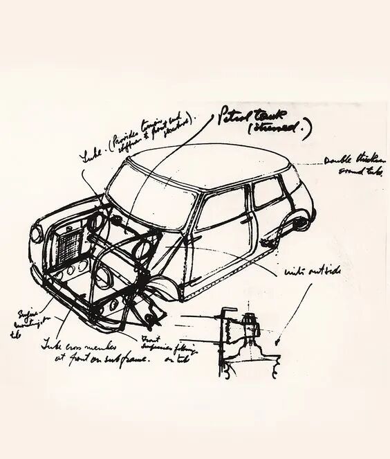 当时刚回到BMC工作的伊斯格尼斯(Issigonis)便接到了这个任务,坊间流传伊斯格尼斯是在酒店的露台上灵感大发,随手在餐巾纸上画下了Mini的第一张草图,然后便诞生了初代“mini”汽车,这款小型车分别在Austin品牌和Morris品牌下销售,一边叫Austin 7,一边叫Morris Mini Minor,1962年更名Mini(注意这里是小写的)。