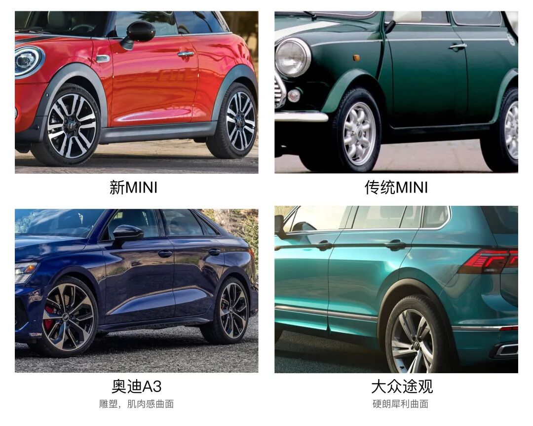 看完整车姿态再来看曲面处理。从上世纪70年代开始,受新浪潮的影响,汽车造型喜欢通过扁平的姿态和硬朗的表面来营造科技感,再到2000年初新锋锐风格的诞生和班戈的火焰燃烧表面,汽车设计朝着流体雕塑的方向发展,表面处理也越来越复杂。而MINI依旧使用了更早期的简单饱满的曲面处理方式,如图16,这也是MINI复古感的来源。
