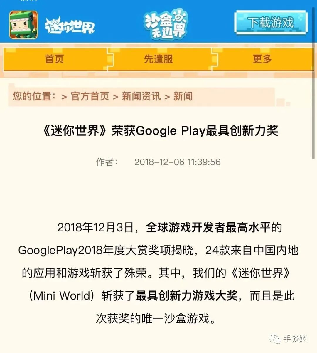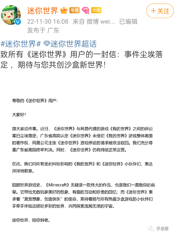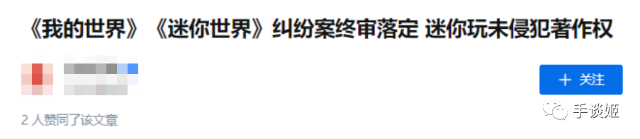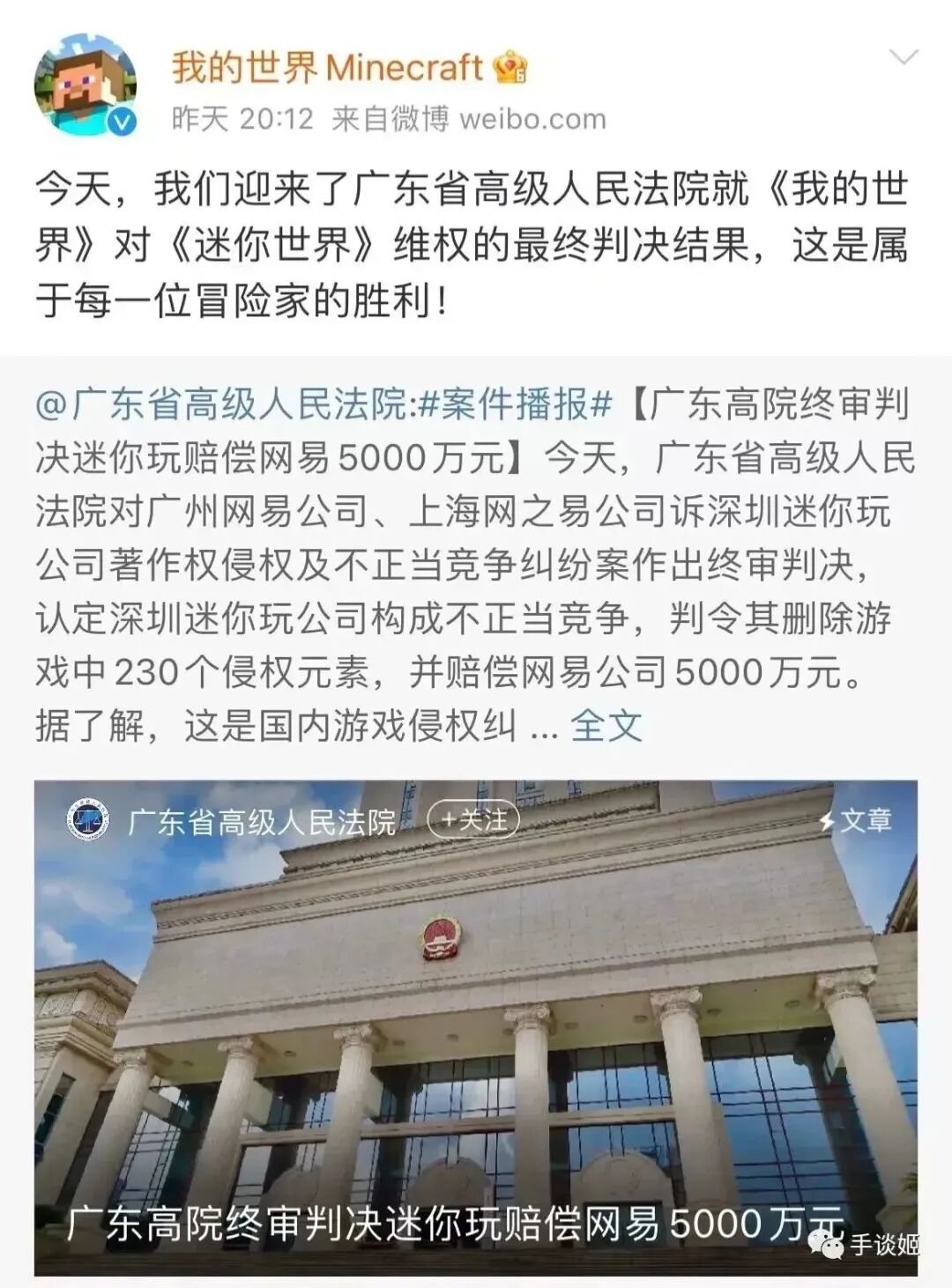 《迷你世界》由深圳迷你玩公司开发,于2016年上线,刚出来那会儿就有玩家觉得它抄袭《我的世界》这样不好,同年,网易获得了国内《我的世界》游戏的代理权,不久便正式起诉了《迷你世界》,对此手谈姬还写过相关文章。