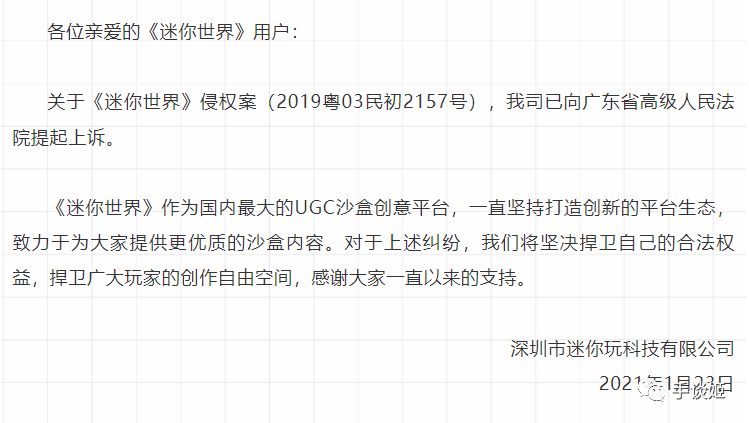 以至于手谈姬第一眼看到最近《迷你世界》一开始放出的公告时,姬还以为它官司打赢了,也有游戏媒体直接报道说,没有侵犯著作权。
