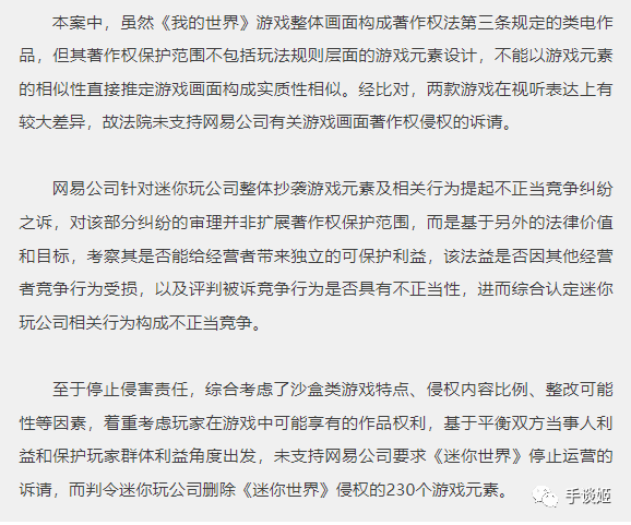 但是法院既然判游戏设计元素侵权了,游戏画面没侵权,要是说《迷你世界》“没侵权”,那姬觉得不能这样说。winwin。