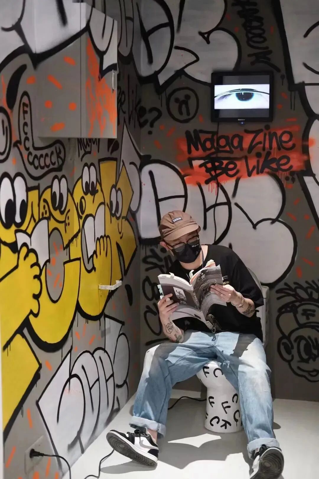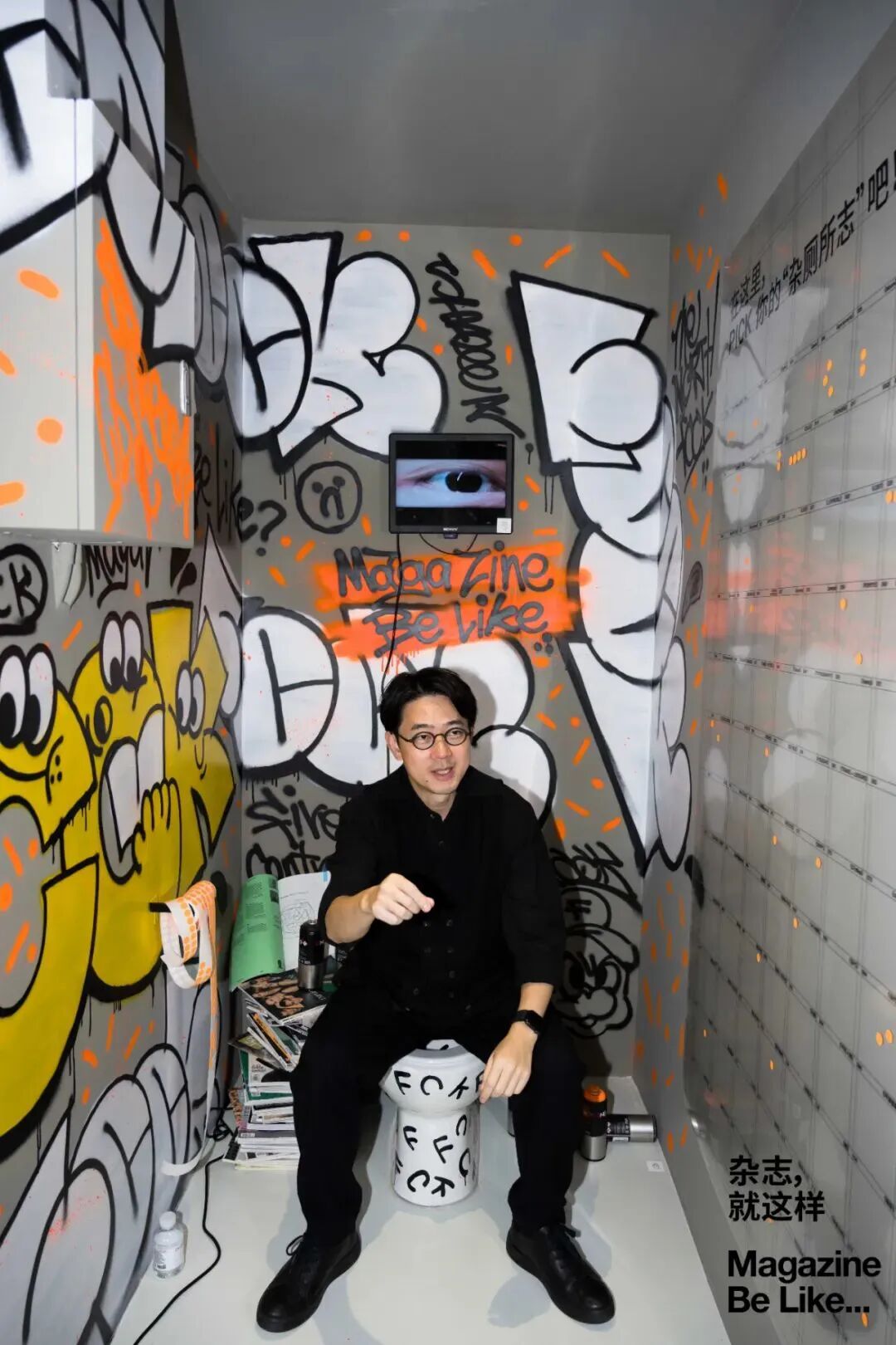 为了给大家呈现一场生动、带有创意,传递“一筑一事”式的审美和调性的杂志展,《杂志,就这样 Magazine be like...》还结合现场装置,静物展示,甚至搭建了一个“杂厕所志”小型空间,并邀请自由插画艺术家 FCCK 在现场创作了涂鸦作品,让“杂厕所志”传递出一种态度,为我们带来了颇具当代艺术效果的视觉和知觉体验,让展览本身显得妙趣横生,富于玩味。