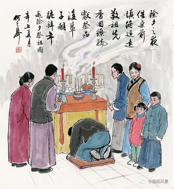 香烟缭绕献祭品,后辈子嗣跪拜年。