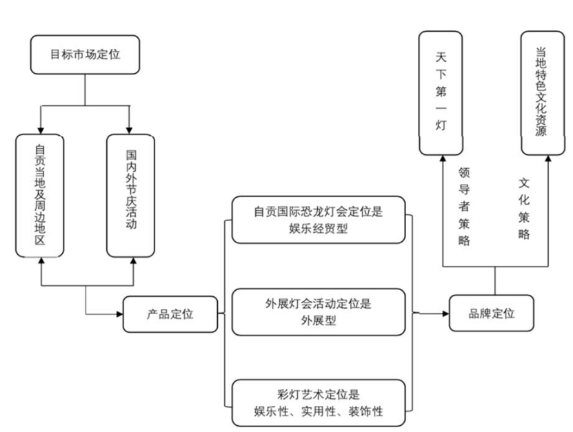 在产品定位上,有专家学者将自贡灯会的变迁划分为四个阶段:第一阶段是自娱自乐型;第二阶段是娱乐经贸型;第三阶段是外向型;第四阶段是从文化活动发展到文化产业。根据所划分的四个阶段可以得出自贡灯会的产品定位。自贡灯会的产品主要是分为自贡国际恐龙灯会、外展灯会活动以及灯彩艺术,它们之间相互融合你中有我、我中有你。自贡国际恐龙灯会的定位是从自娱自乐型向娱乐经贸型转换;外展灯会活动的定位是外向型;灯彩艺术的产品定位则是从彩灯产业延伸出的装饰性、娱乐性、实用性。