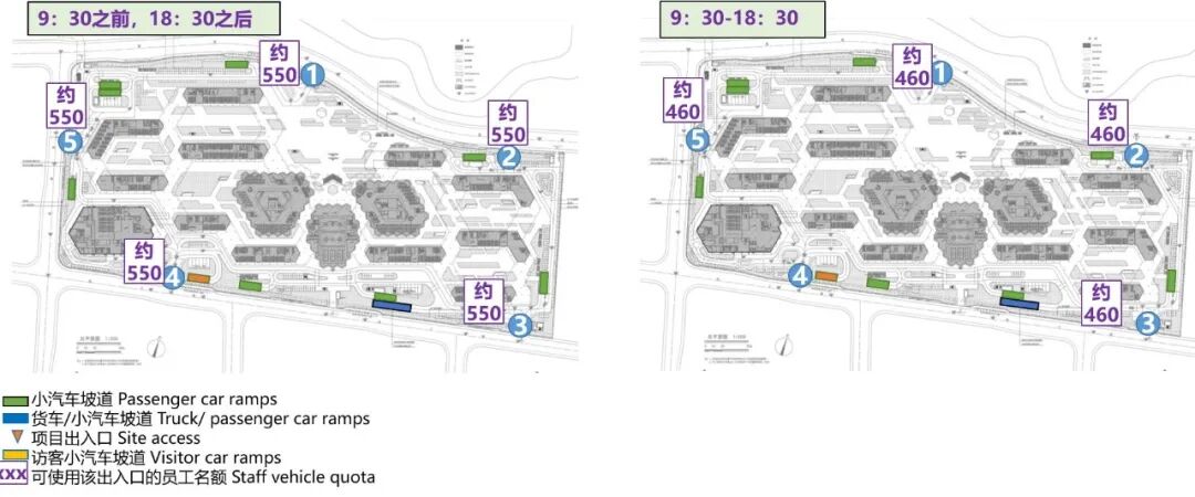 为满足使用需求,项目地块内需配建约5,000个停车位。同时,园区在未来运营中将呈现进出交通集中,潮汐性明显的特征。奥雅纳交通顾问配合业主及建筑师,合理设计了车辆到发路径,使其与外部市政道路顺畅衔接,避免交织冲突及因交通量集中而产生拥堵。