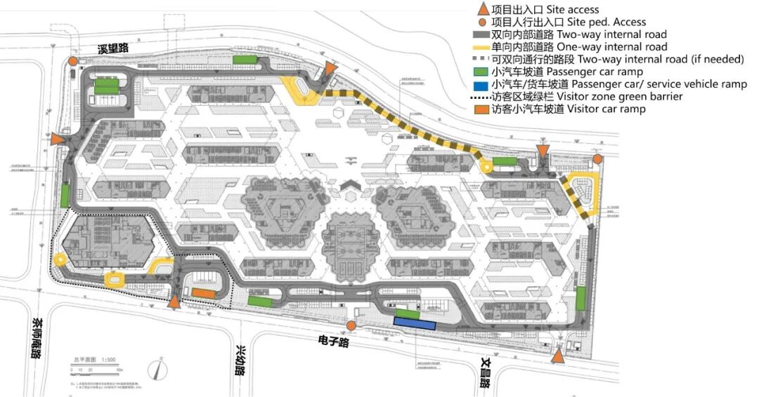 奥雅纳为项目方案设计阶段的交通规划与设计工作提供支持,服务内容主要包括结合阿里巴巴园区交通特征与需求,对项目总平交通安排、出入口布局、内部各类型交通流线与组织、静态交通设施、后勤交通衔接、行人交通策略等提出评议和优化建议。