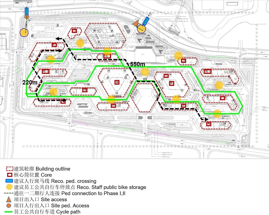 进入园区后,员工可根据需要选择骑自行车或步行抵达目的地。任意办公场地间,都可在不到一分钟的时间内,经由屋顶花园等户外绿色空间抵达。项目旨在为员工及访客设计一个联通、速达、环保的新一代未来办公园区。