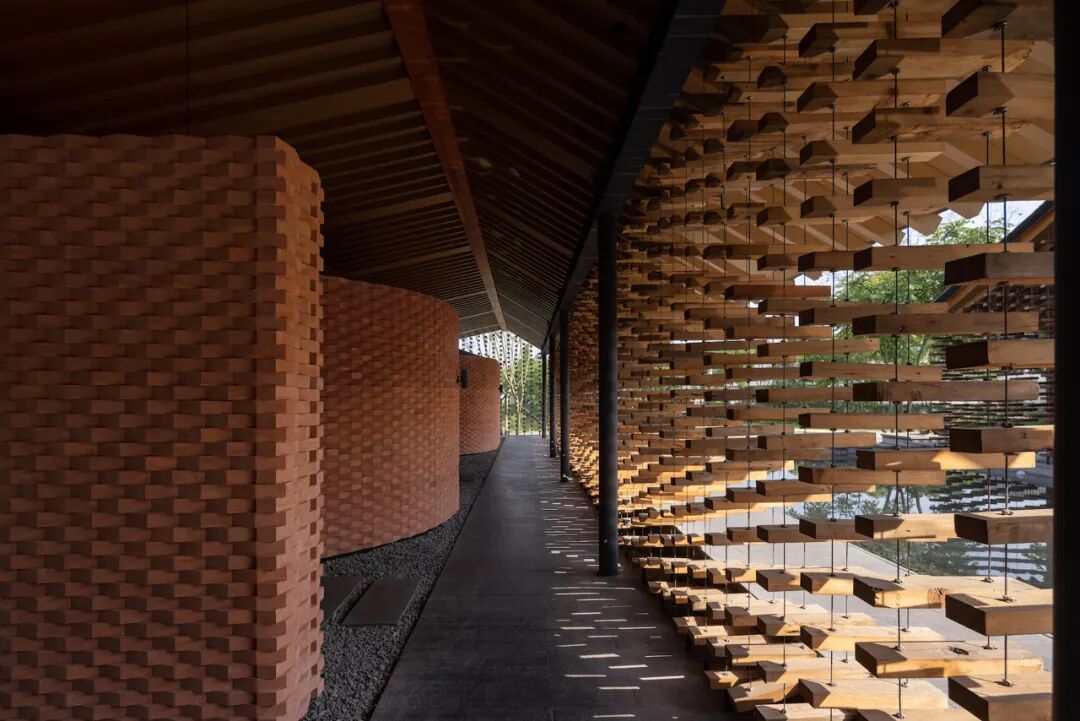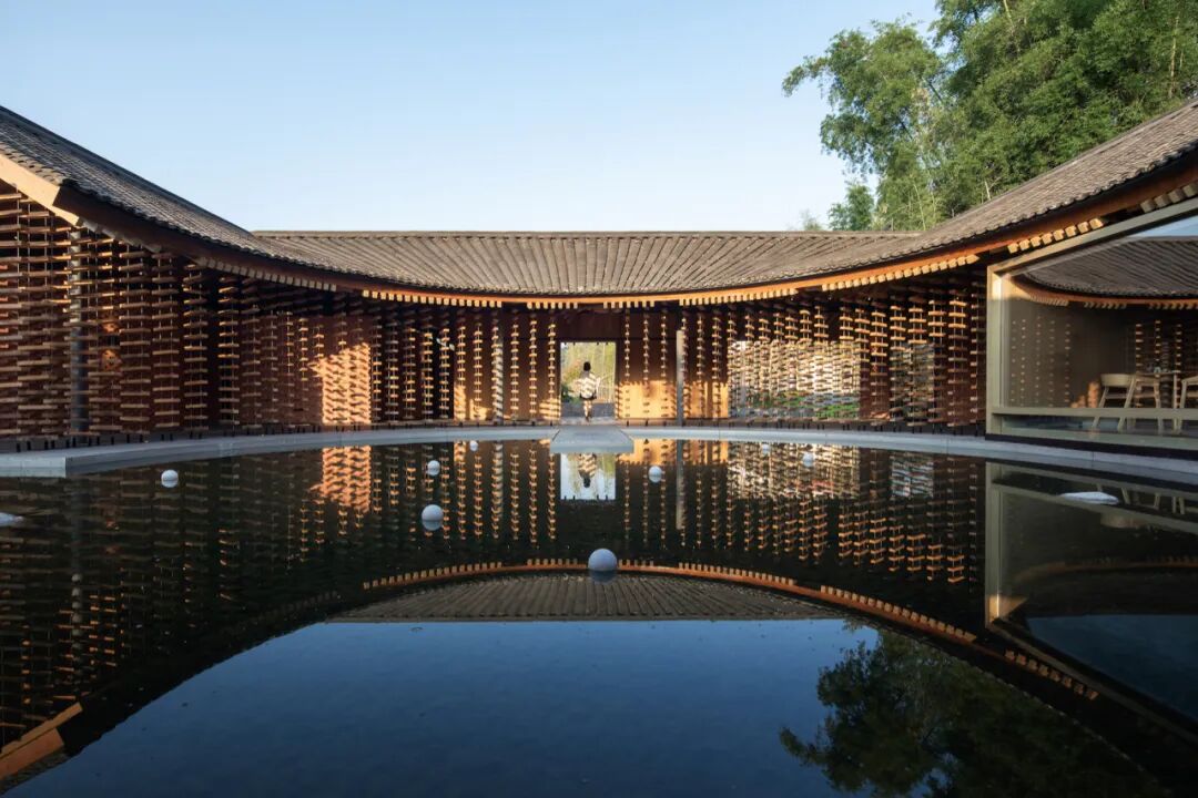 建筑结合传统营造与当下施工条件,巧拙相间平衡质朴与精致。圆形水面平静,柴木、红石、黛瓦、融入天青。材料交叠错置给建筑空间带来如日晷一般的时间痕迹。随着光线流动,光影变幻莫测,浮光掠影般的氛围迷漫独特。
