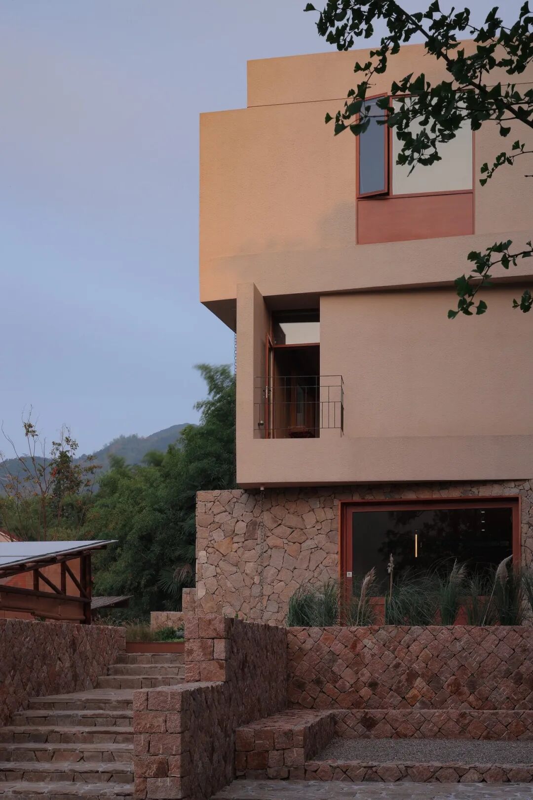 材料:真石漆、毛石(建筑外立面);真石漆(室内墙面);黏土红砖(室内地面);桦木板(木饰面);8mm钢筋(楼梯及阳台栏杆)