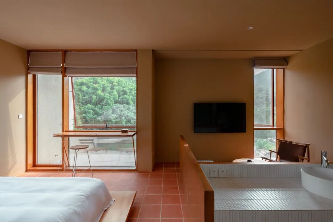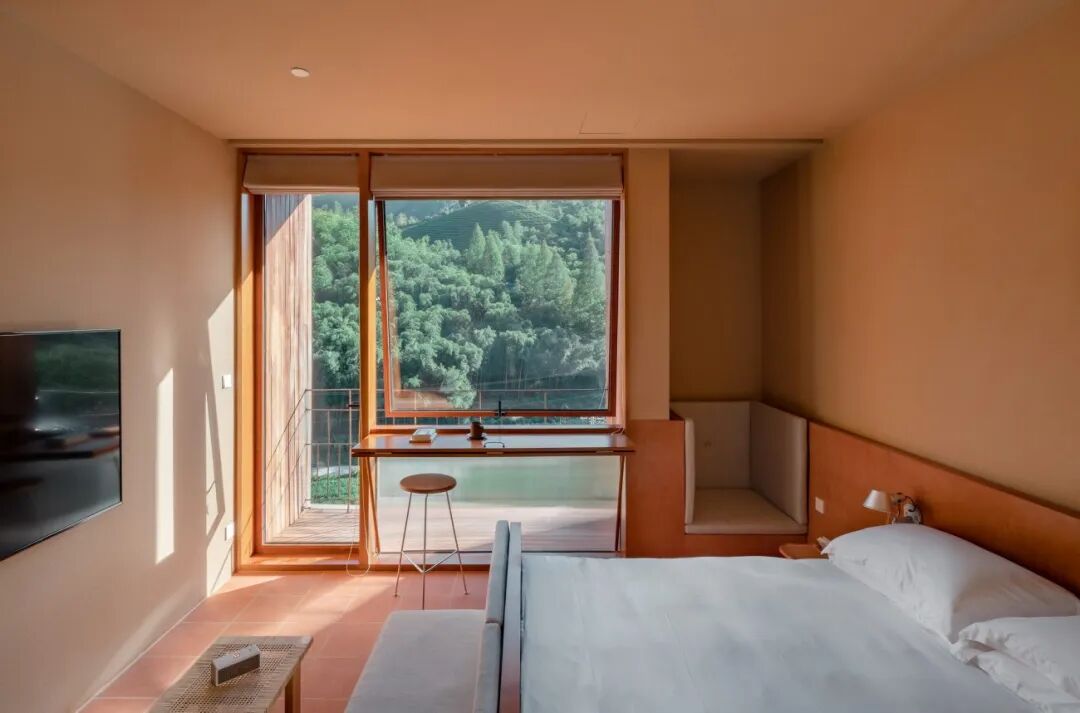 场地四周拥有丰富多样的景色和植物,因此我们希望将其进行重新梳理,从多个角度觅寻周围的水杉、茶田、竹林和远处的山峦,形成了视觉对景。同时通过建筑内部的路径动线设计,有节奏地将每个景色排列到每个窗景上,如同一幅展开的山水长卷。