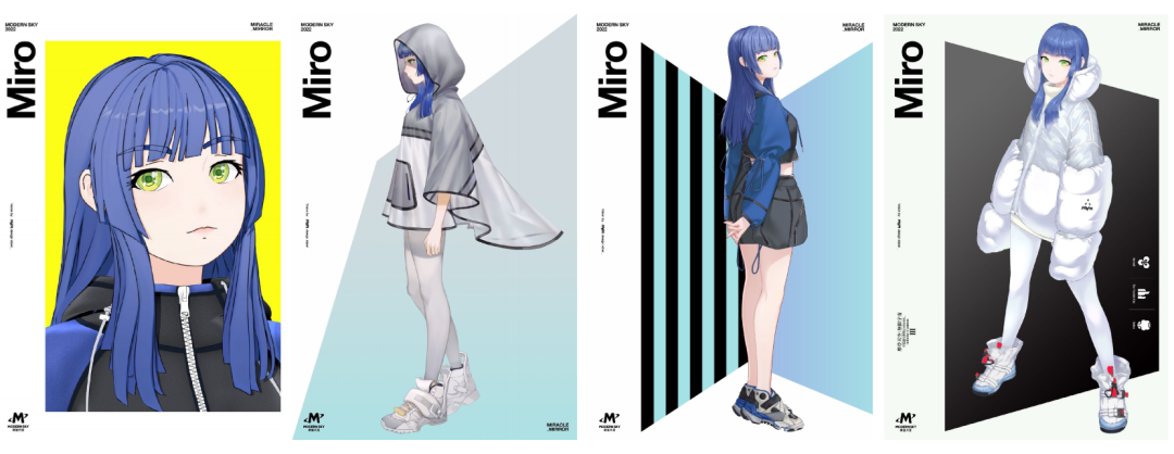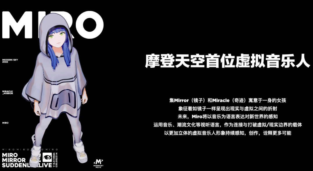 摩登天空首位虚拟音乐人,集Mirror(镜子)和Miracle(奇迹)寓意于一身的女孩,象征着如镜子一样呈现出现实与虚拟之间的折射未来。Miro将以音乐为语言表达对新世界的感知,运用音乐、潮流文化等视听语言,作为连接与打破虚拟/现实边界的载体,以更加立体的虚拟音乐人形象持续感知,创作,诠释更多可能。